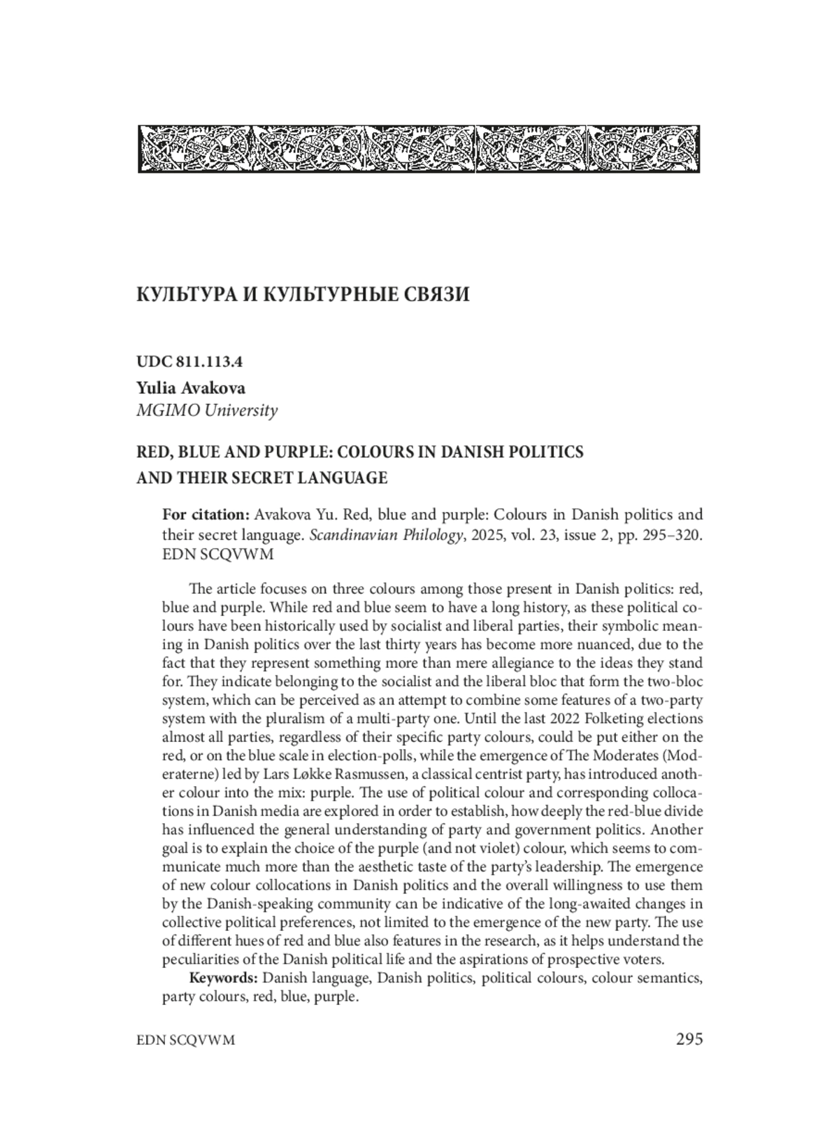 5. Vejdemo, S., Levisen C., van Scherpenberg C., Guðmundsdóttir Beck þ., Næss Å., Zimmermann M., Stockall L., Whelpton M. Two kinds of pink: Development and difference in Germanic colour semantics. Language Sciences, 2014. P. 1-17. DOI: 10.1016/j.langsci.2014.07.007