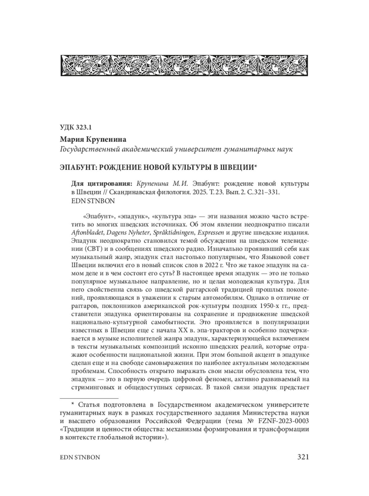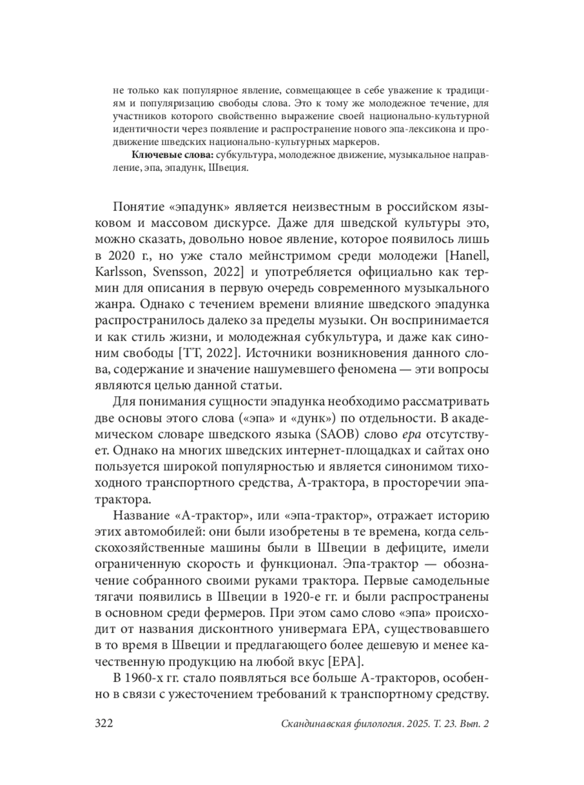 «Эпабунт», «эпадунк», «культура эпа» — эти названия можно часто встретить во многих шведских источниках. Об этом явлении неоднократно писали Aftonbladet, Dagens Nyheter, Språktidningen, Expressen и другие шведские издания. Эпадунк неоднократно становился темой обсуждения на шведском телевидении (СВТ) и в сообщениях шведского радио. Изначально проявивший себя как музыкальный жанр, эпадунк стал настолько популярным, что Языковой совет Швеции включил его в новый список слов в 2022 г. Что же такое эпадунк на самом деле и в чем состоит его суть? В настоящее время эпадунк — это не только популярное музыкальное направление, но и целая молодежная культура. Для него свойственна связь со шведской раггарской традицией прошлых поколений, проявляющаяся в уважении к старым автомобилям. Однако в отличие от раггаров, поклонников американской рок-культуры поздних 1950-х гг., представители эпадунка ориентированы на сохранение и продвижение шведской национально-культурной самобытности. Это проявляется в популяризации известных в Швеции еще с начала XX в. эпа-тракторов и особенно подчеркивается в музыке исполнителей жанра эпадунк, характеризующейся включением в тексты музыкальных композиций исконно шведских реалий, которые отражают особенности национальной жизни. При этом большой акцент в эпадунке сделан еще и на свободе самовыражения по наиболее актуальным молодежным проблемам. Способность открыто выражать свои мысли обусловлена тем, что эпадунк — это в первую очередь цифровой феномен, активно развиваемый на стриминговых и общедоступных сервисах. В такой связи эпадунк предстает не только как популярное явление, совмещающее в себе уважение к традициям и популяризацию свободы слова. Это к тому же молодежное течение, для участников которого свойственно выражение своей национально-культурной идентичности через появление и распространение нового эпа-лексикона и продвижение шведских национально-культурных маркеров