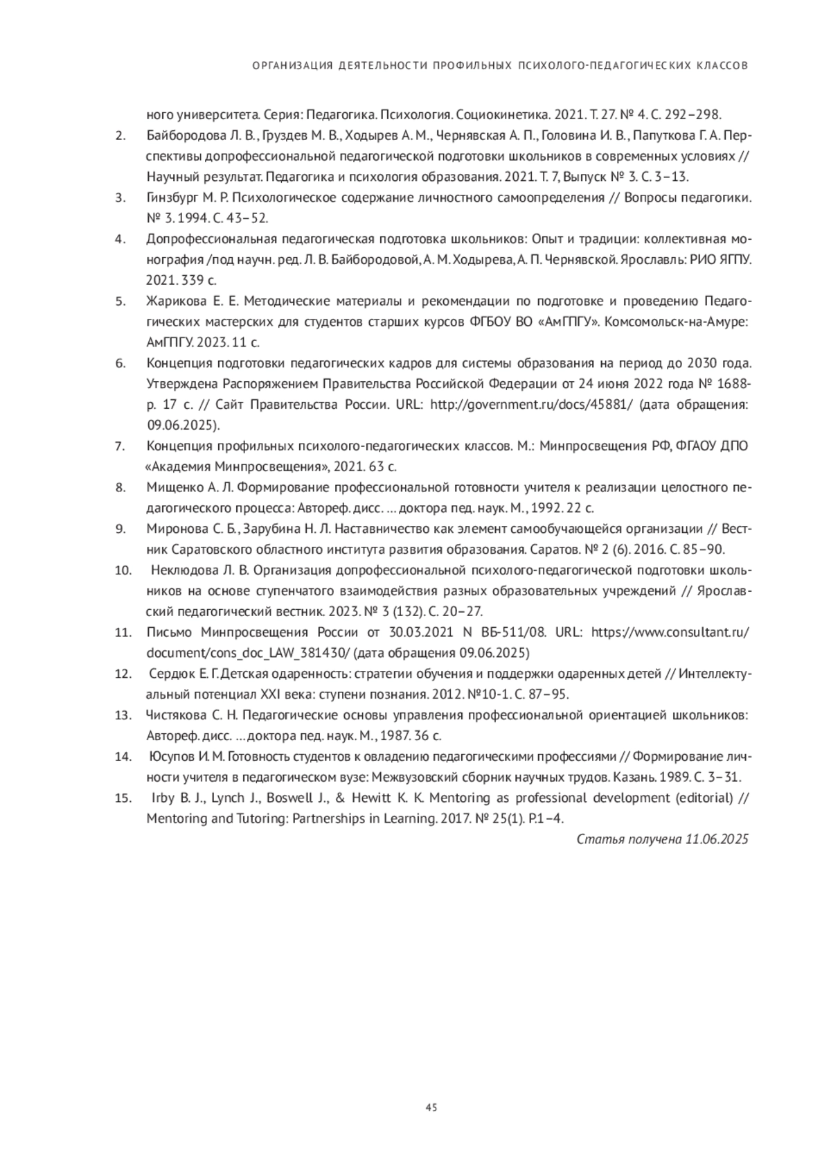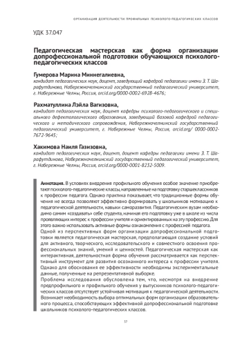 1. Артемьева Л. Н., Мухамедьярова Н. А. Особенности допрофессиональной педагогической подготовки школьников на базе организаций высшего образования // Вестник Костромского государственного университета. Серия: Педагогика. Психология. Социокинетика. 2021. Т. 27. № 4. С. 292-298. EDN: ILRZUV