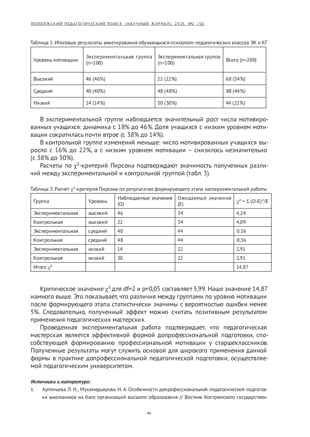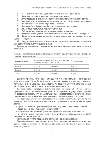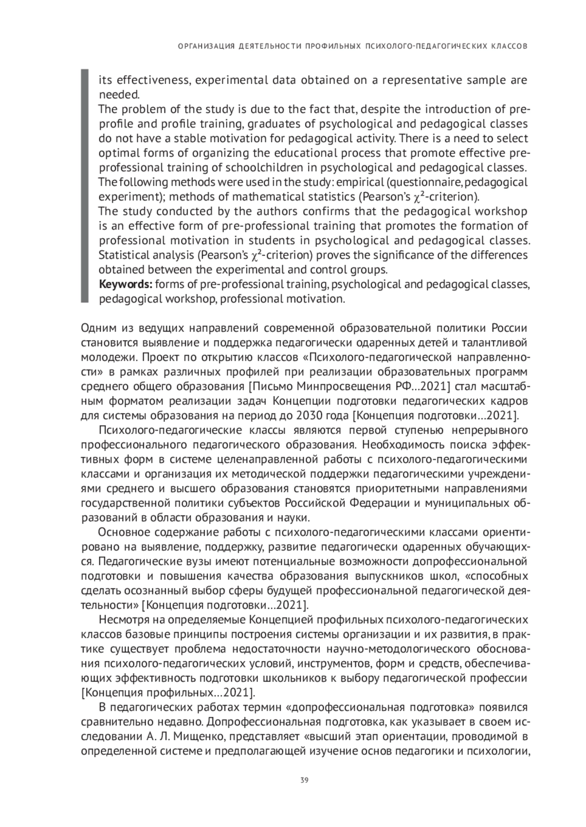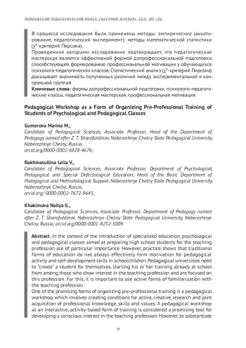 В условиях внедрения профильного обучения особое значение приобретают психолого-педагогические классы, направленные на подготовку старшеклассников к профессии педагога. Однако практика показывает, что традиционные формы обучения не всегда позволяют эффективно формировать у школьников мотивацию к педагогической деятельности, навыки саморазвития. Педагогическим вузам необходимо самим «создавать» себе студента, начиная его подготовку уже в школе из числа проявляющих интерес к профессии учителя и ориентированных на эту профессию. Для этого важно использовать активные формы ознакомления с профессией педагога. Одной из перспективных форм организации допрофессиональной подготовки является педагогическая мастерская, предполагающая создание условий для активного, творческого, исследовательского и совместного освоения профессиональных знаний, умений и ценностей. Педагогическая мастерская как интерактивная, деятельностная форма обучения рассматривается как перспективный инструмент для развития осознанного интереса к профессии учителя. Однако для обоснования ее эффективности необходимы экспериментальные данные, полученные на репрезентативной выборке. Проблема исследования обусловлена тем, что, несмотря на внедрение предпрофильного и профильного обучения у выпускников психолого- педагогических классов отсутствует устойчивая мотивация к педагогической деятельности. Возникает необходимость выбора оптимальных форм организации образовательного процесса, способствующих эффективной допрофессиональной подготовке школьников психолого-педагогических классов. В процессе исследования были применены методы: эмпирические (анкетирование, педагогический эксперимент); методы математической статистики (χ²-критерий Пирсона). Проведенное авторами исследование подтверждает, что педагогическая мастерская является эффективной формой допрофессиональной подготовки, способствующей формированию профессиональной мотивации у обучающихся психолого-педагогических классов. Статистический анализ (χ²-критерий Пирсона) доказывает значимость полученных различий между экспериментальной и контрольной группой.