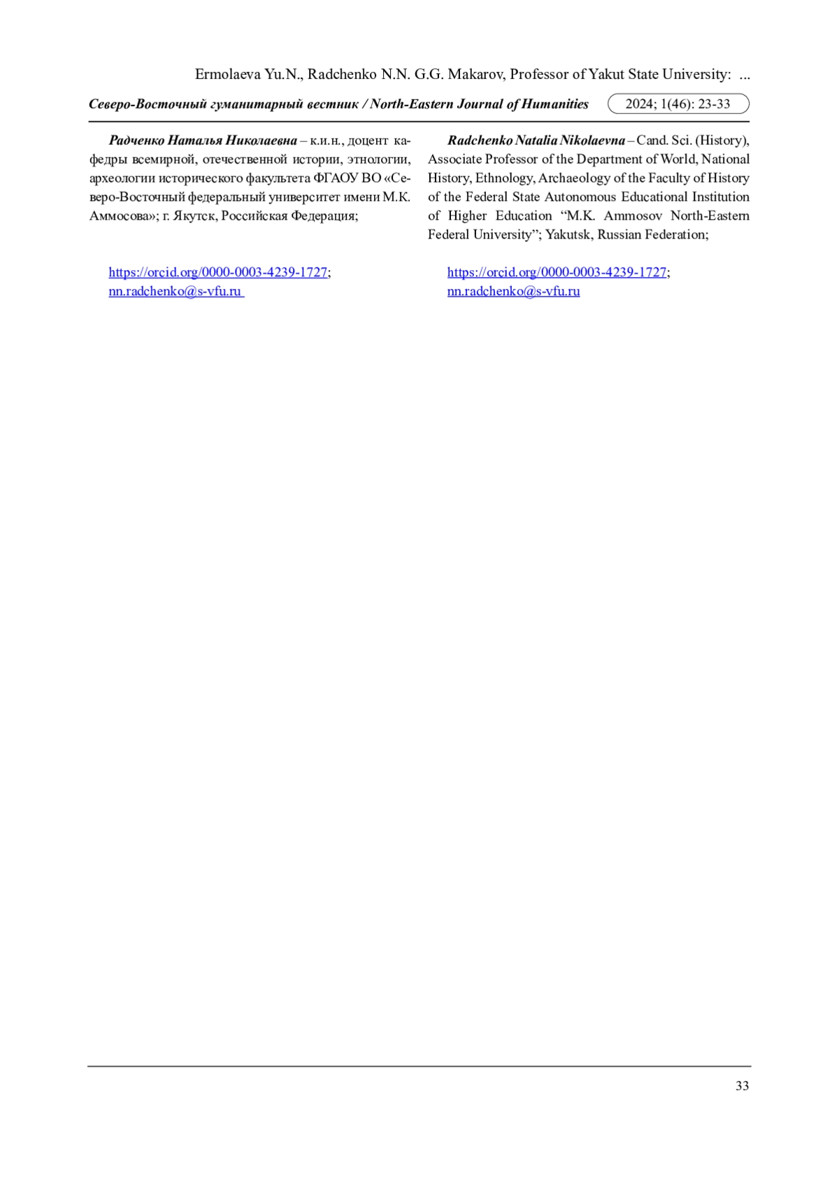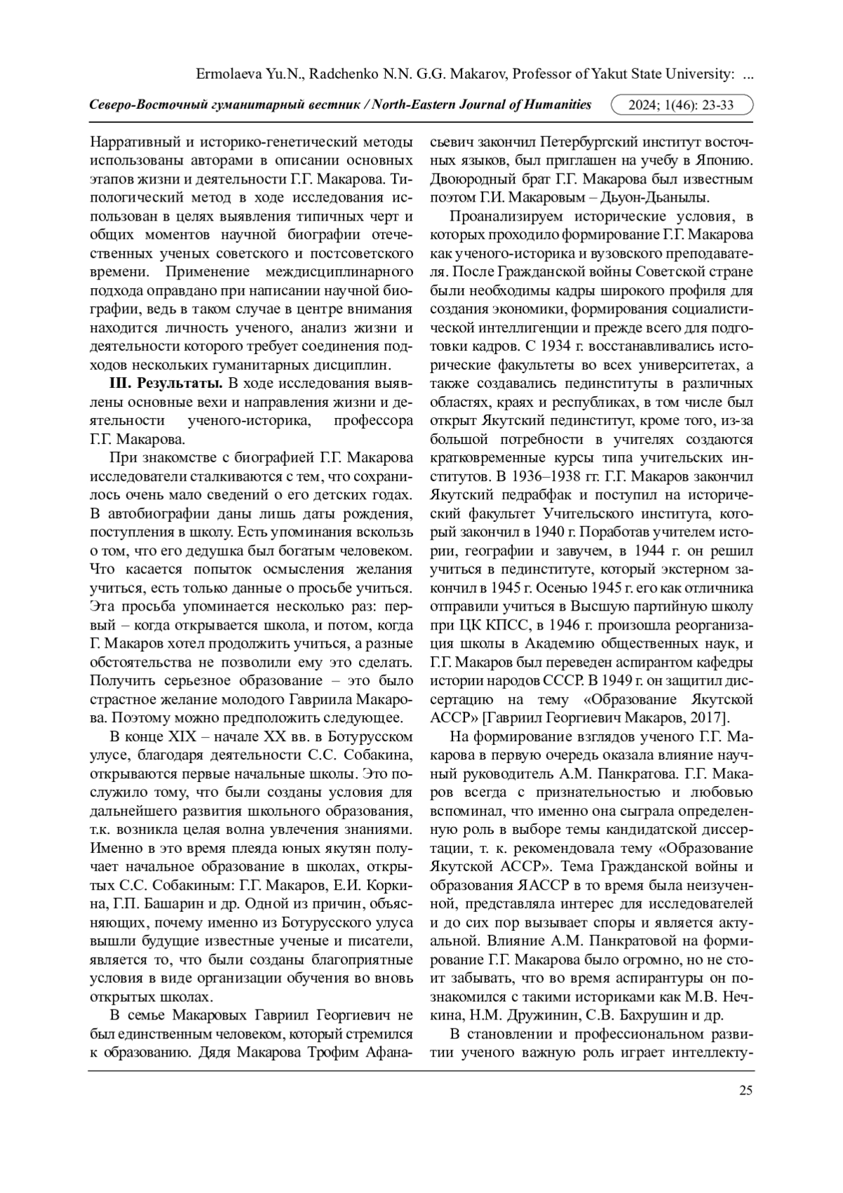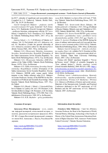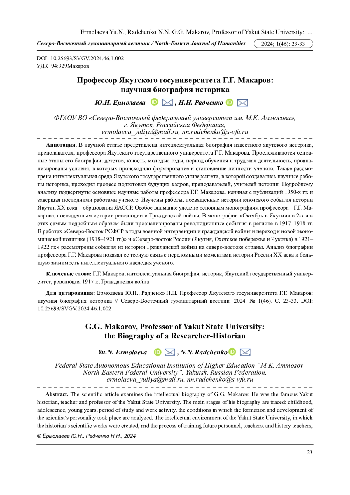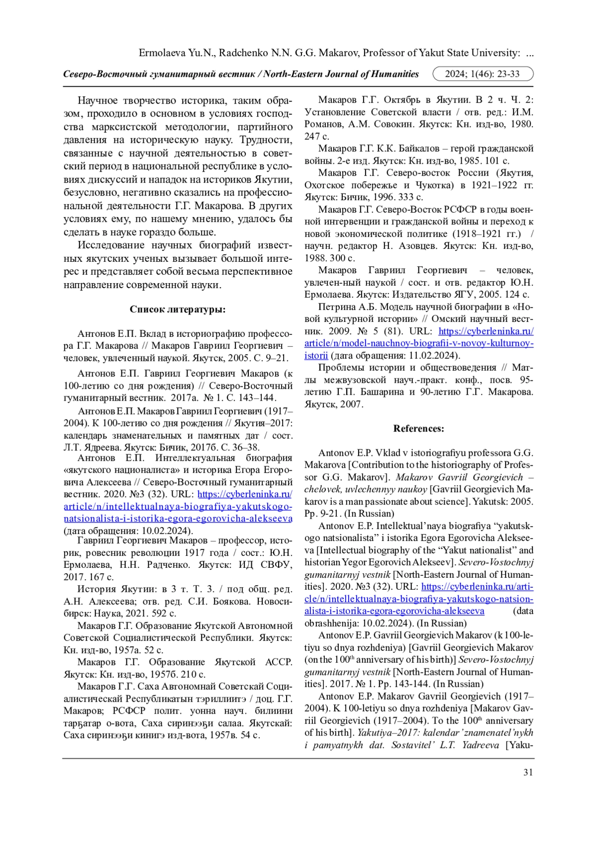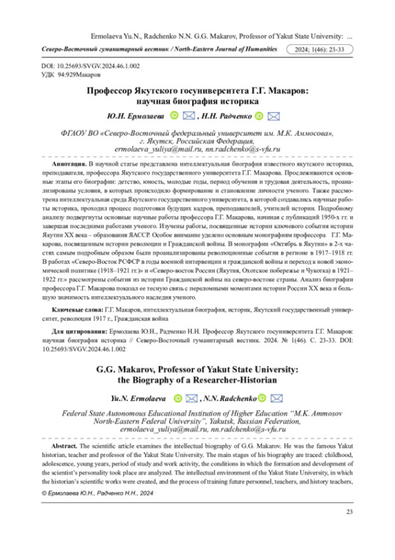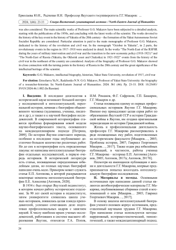 В научной статье представлена интеллектуальная биография известного якутского историка, преподавателя, профессора Якутского государственного университета Г. Г. Макарова. Прослеживаются основные этапы его биографии: детство, юность, молодые годы, период обучения и трудовая деятельность, проанализированы условия, в которых происходило формирование и становление личности ученого. Также рассмотрена интеллектуальная среда Якутского государственного университета, в которой создавались научные работы историка, проходил процесс подготовки будущих кадров, преподавателей, учителей истории. Подробному анализу подвергнуты основные научные работы профессора Г. Г. Макарова, начиная с публикаций 1950-х гг. и завершая последними работами ученого. Изучены работы, посвященные истории ключевого события истории Якутии ХХ века - образования ЯАССР. Особое внимание уделено основным монографиям профессора Г. Г. Макарова, посвященным истории революции и Гражданской войны. В монографии «Октябрь в Якутии» в 2-х частях самым подробным образом были проанализированы революционные события в регионе в 1917-1918 гг. В работах «Северо-Восток РСФСР в годы военной интервенции и гражданской войны и переход к новой экономической политике (1918-1921 гг.)» и «Северо-восток России (Якутия, Охотское побережье и Чукотка) в 1921- 1922 гг.» рассмотрены события из истории Гражданской войны на северо-востоке страны. Анализ биографии профессора Г. Г. Макарова показал ее тесную связь с переломными моментами истории России ХХ века и большую значимость интеллектуального наследия ученого.
