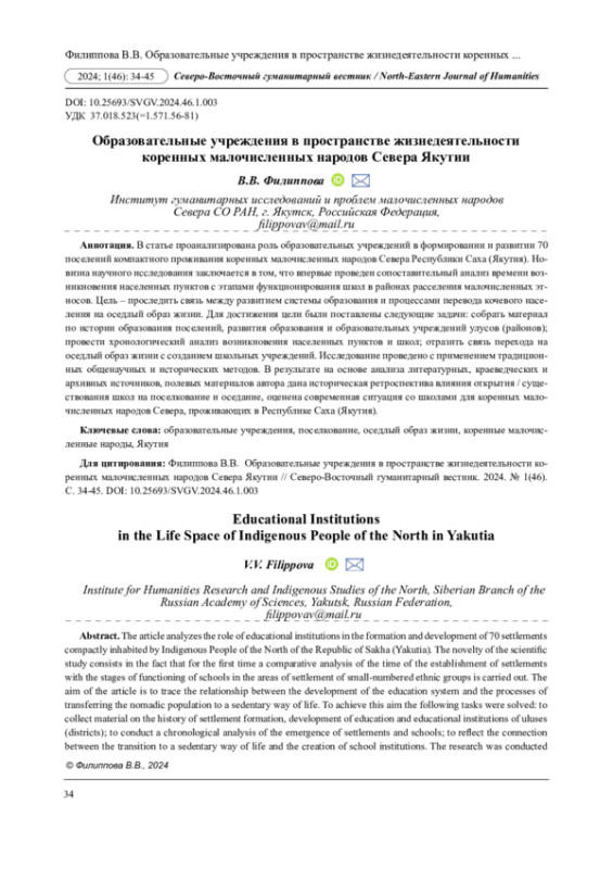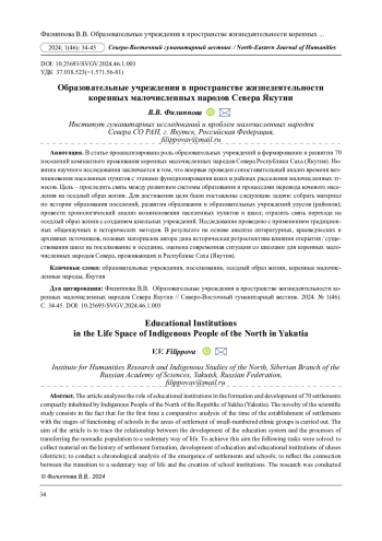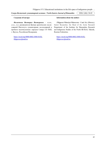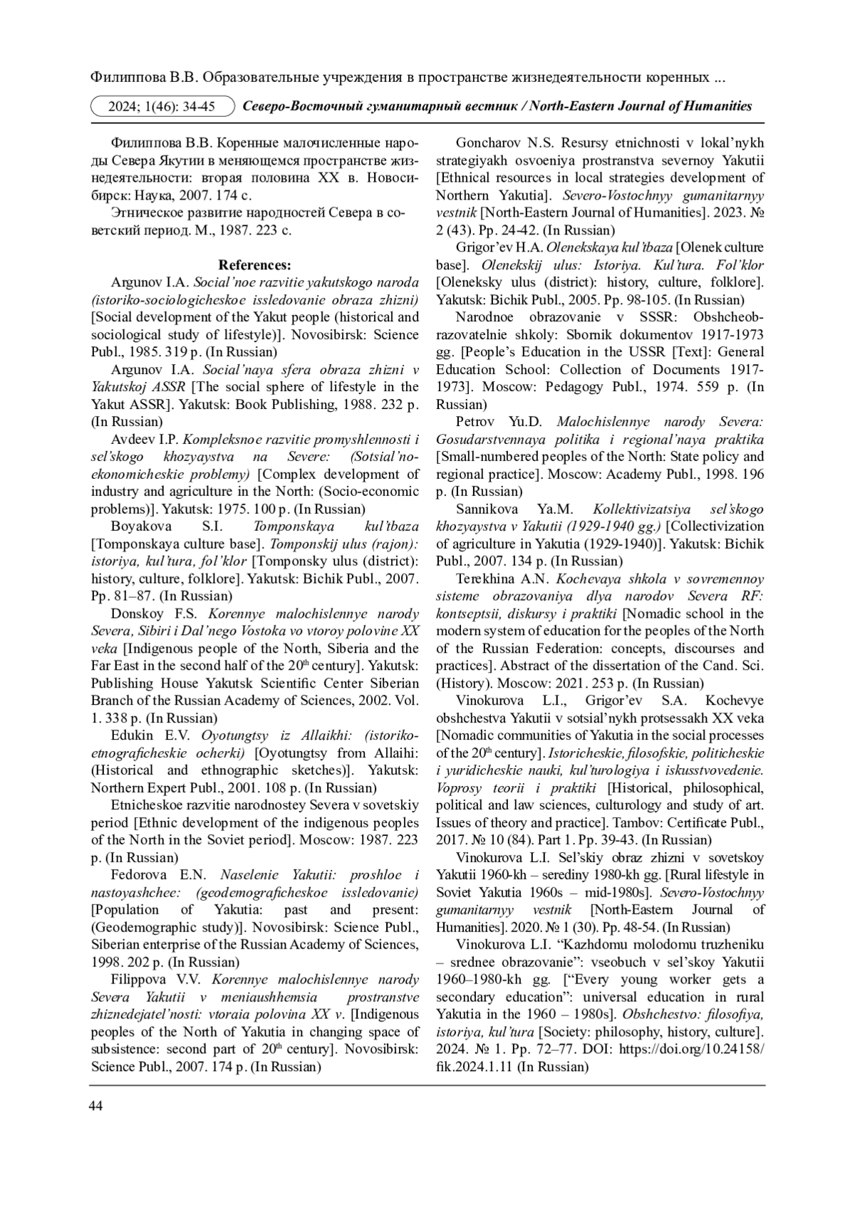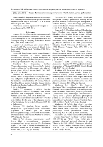 17. Филиппова В.В. Коренные малочисленные народы Севера Якутии в меняющемся пространстве жизнедеятельности: вторая половина XX в. Новосибирск: Наука, 2007. 174 с. EDN: PKANMJ