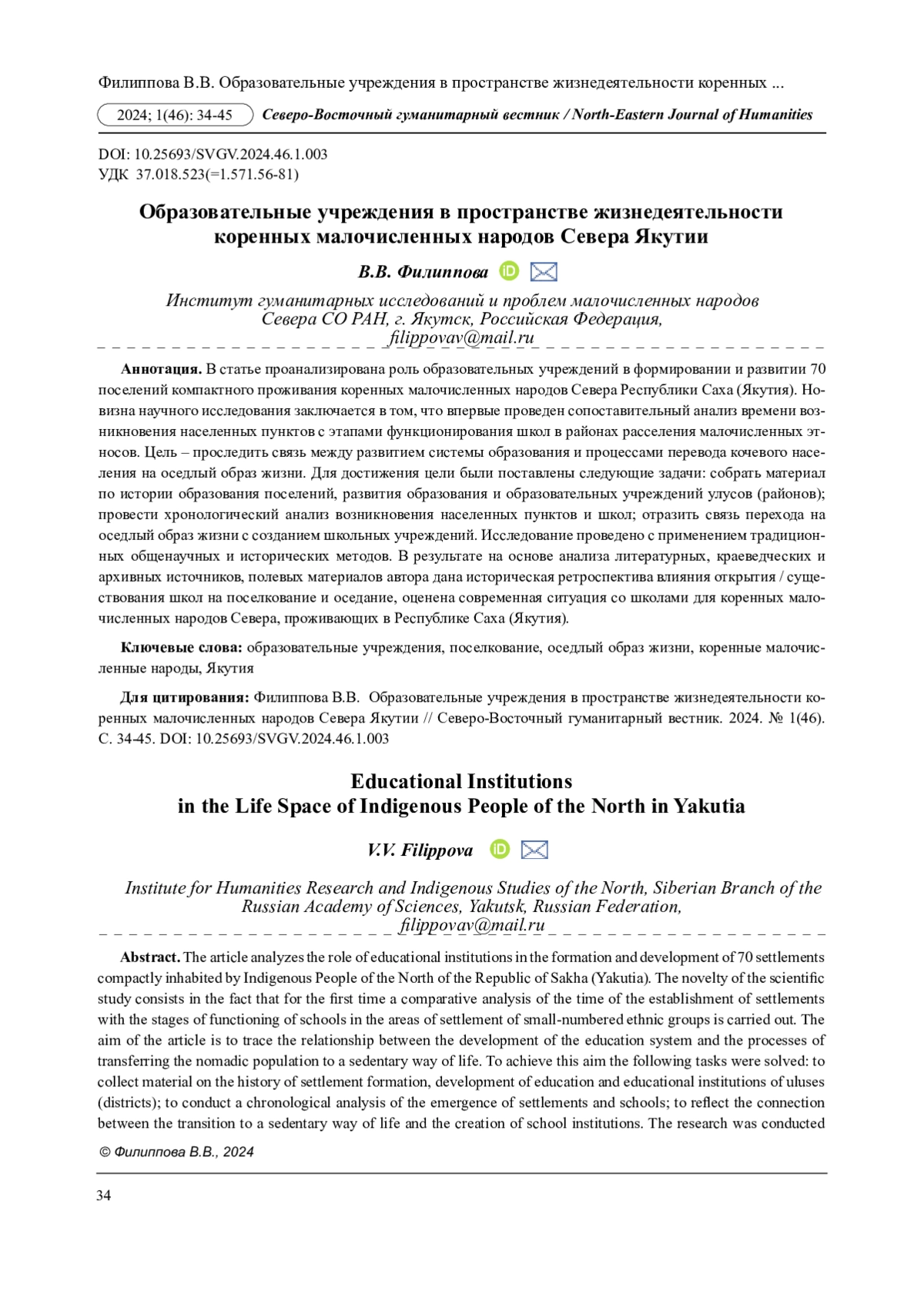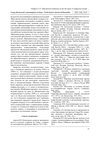 15. Терехина А.Н. Кочевая школа в современной системе образования для народов Севера РФ: концепции, дискурсы и практики: автореф. дис.... канд. истор. наук. М., 2021. 253 с. EDN: GTLLAT