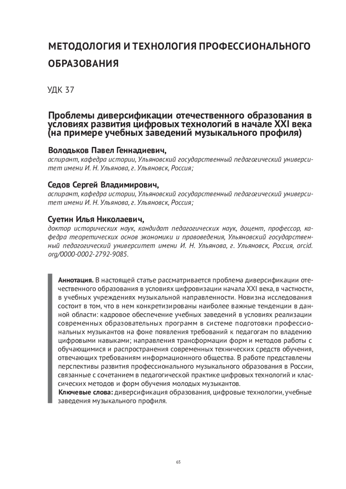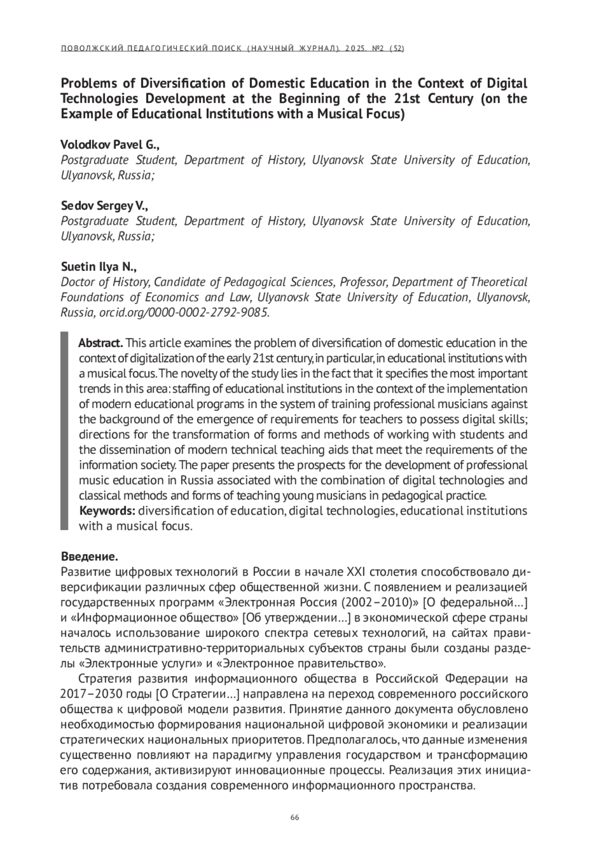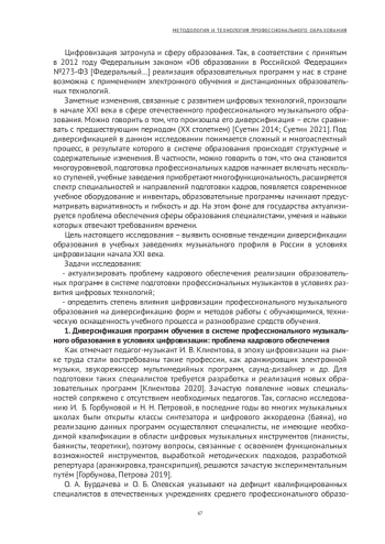 В настоящей статье рассматривается проблема диверсификации отечественного образования в условиях цифровизации начала XXI века, в частности, в учебных учреждениях музыкальной направленности. Новизна исследования состоит в том, что в нем конкретизированы наиболее важные тенденции в данной области: кадровое обеспечение учебных заведений в условиях реализации современных образовательных программ в системе подготовки профессиональных музыкантов на фоне появления требований к педагогам по владению цифровыми навыками; направления трансформации форм и методов работы с обучающимися и распространения современных технических средств обучения, отвечающих требованиям информационного общества. В работе представлены перспективы развития профессионального музыкального образования в России, связанные с сочетанием в педагогической практике цифровых технологий и классических методов и форм обучения молодых музыкантов.