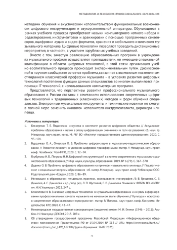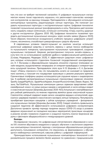 6. Клиентова И. В. Значение цифровых технологий в музыкальном образовании и их роль в формировании профессиональных качеств музыканта на начальном этапе обучения // Культура и искусство в современном образовательном пространстве: матер. IV Всеросс. науч.-практ. конф. Кострома: Издательство КГУ, 2020. С. 43-47. EDN: CNVMMX