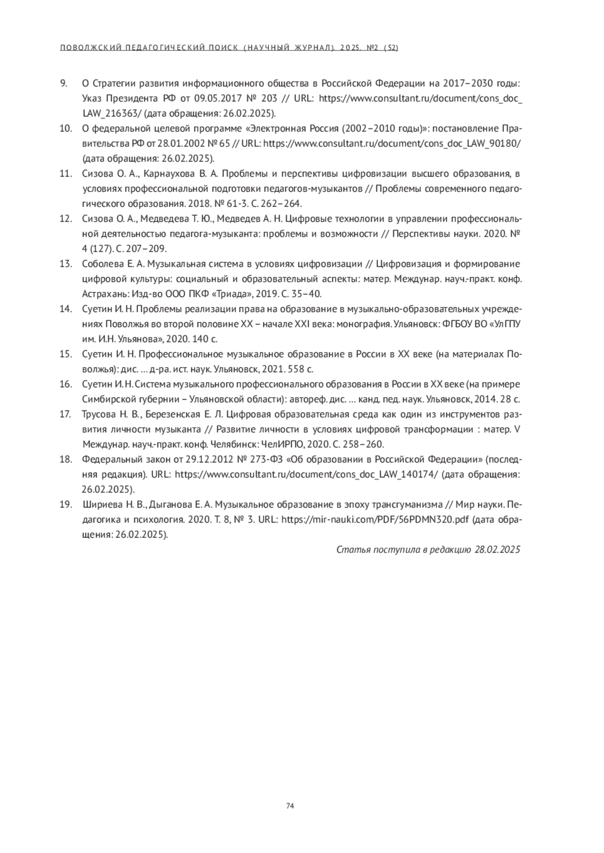 13. Соболева Е. А. Музыкальная система в условиях цифровизации // Цифровизация и формирование цифровой культуры: социальный и образовательный аспекты: матер. Междунар. науч.-практ. конф. Астрахань: Изд-во ООО ПКФ “Триада”, 2019. С. 35-40. EDN: KMXHBN