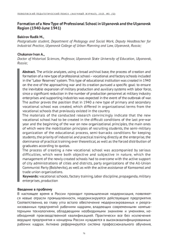 В статье на широкой архивной базе анализируется процесс создания и становления профессиональной школы нового типа - ремесленных и фабрично- заводских училищ, входящих в систему «Трудовых резервов». Данный тип учебных заведений был создан в 1940 году в преддверии приближающейся войны, и его создание преследовало конкретную цель: обеспечить неминуемое расширение военного производства и вспомогательных систем рабочей силой, так как предполагалось значительное сокращение количества производственных кадров на предприятиях военной промышленности и обеспечивающих производств в случае начала войны. Автор доказывает, что в 1940 году был создан именно новый тип начальной и средней профессиональной школы, отличающейся в организационном плане от ранее существующих в стране профессионально-технических училищ. Материалы проведенного исследования убедительно свидетельствуют о том, что новую профессиональную школу пришлось создавать в трудных условиях последнего предвоенного года и начинающейся войны на новых организационных принципах, главными из которых были мобилизационные принципы комплектования контингента обучаемых, полувоенная организация учебно-воспитательного процесса, полуказарменные условия содержания учеников, приоритетное значение производственно-практического обучения непосредственно на предприятии, доминирование практического обучения над теоретическим, а также принудительное распределение выпускников по разнарядкам. Процесс создания новой профессионально-технической школы сопровождался серьезными трудностями, которые носили как объективный, так и субъективный характер, которые пришлось преодолевать дирекции вновь созданных училищ при активной поддержке городских администраций городов и районов, партийных организаций Всесоюзной коммунистической партии (большевиков), а также при активном содействии комсомольских и профсоюзных организаций.