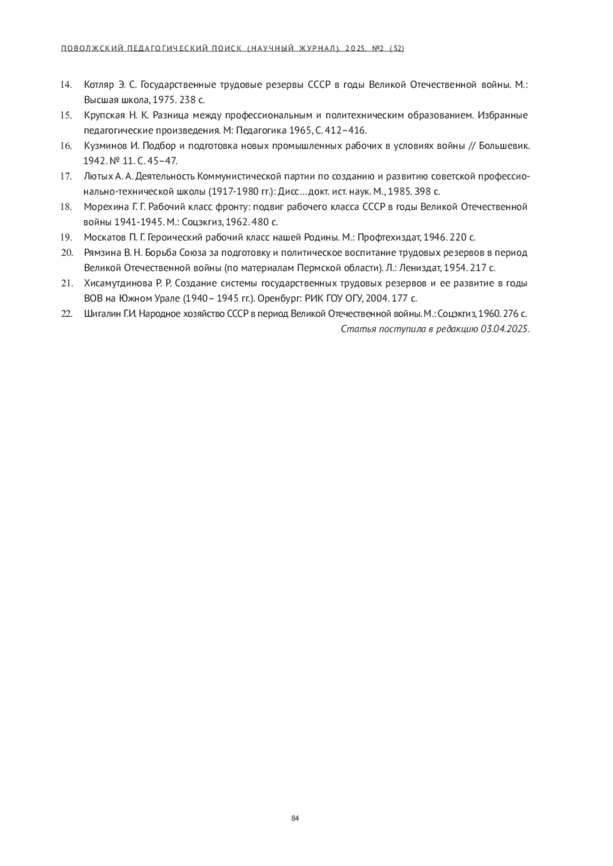 14. Котляр Э. С. Государственные трудовые резервы СССР в годы Великой Отечественной войны. М.: Высшая школа, 1975. 238 с.