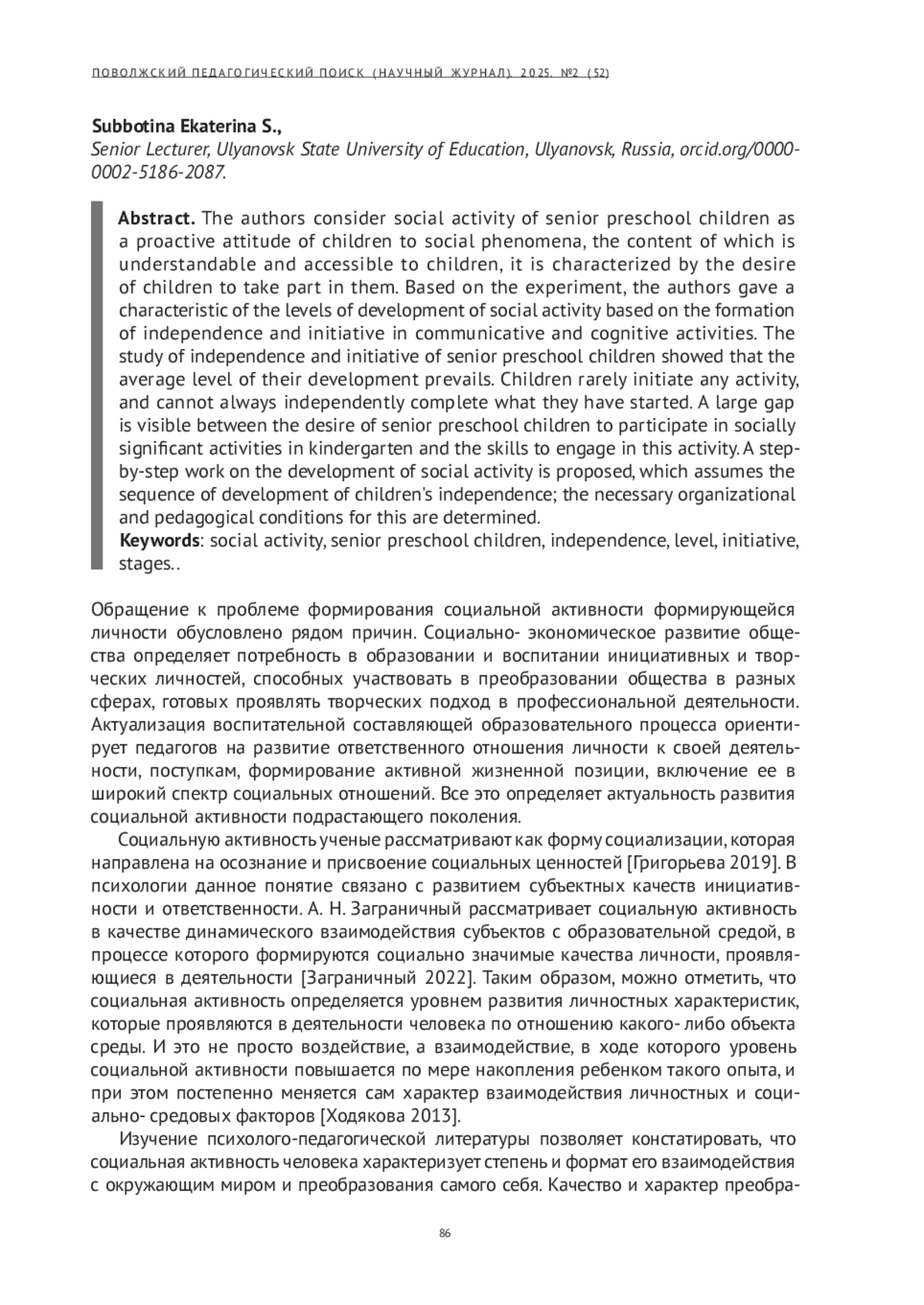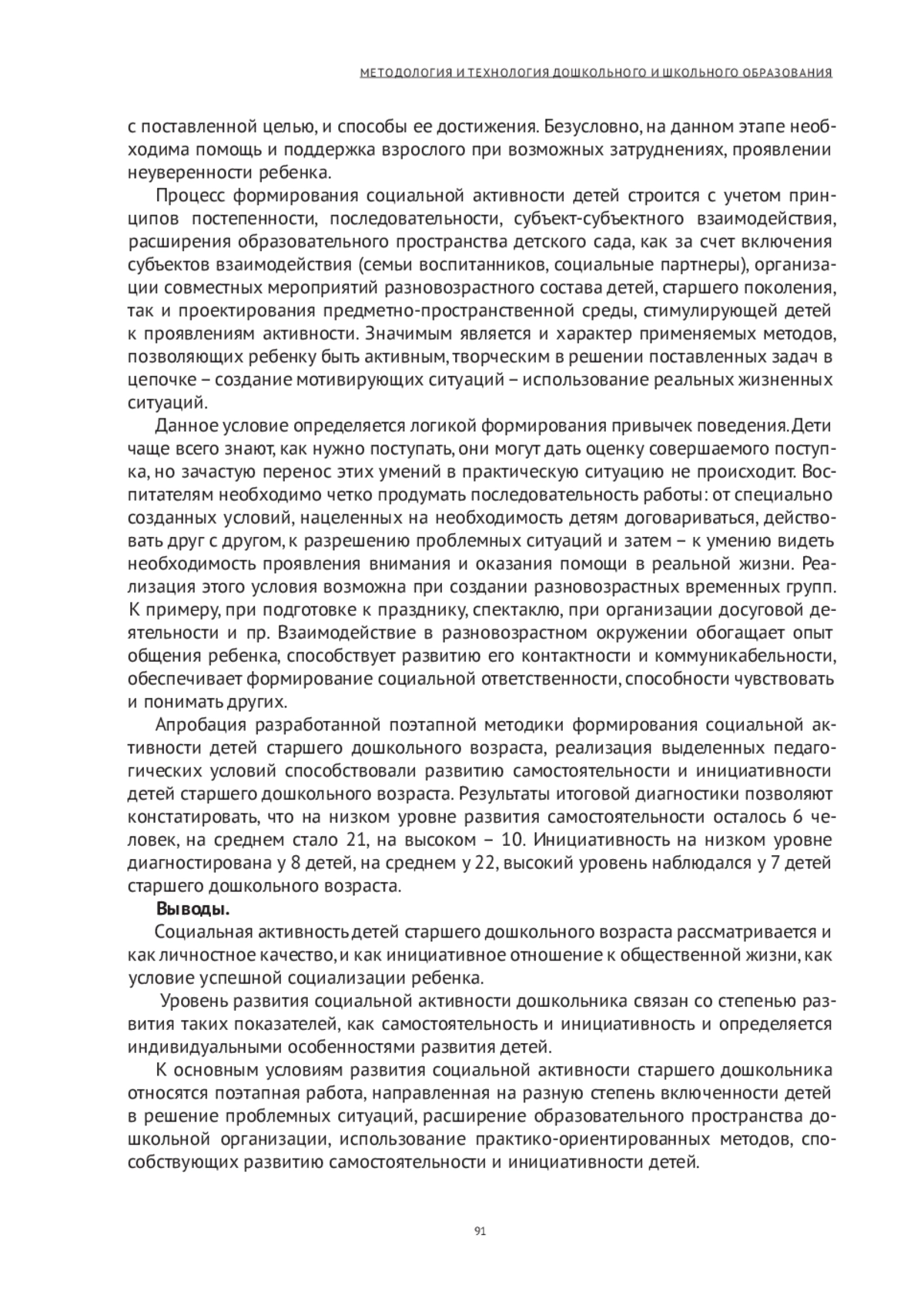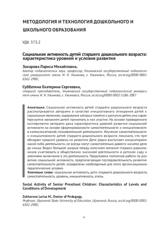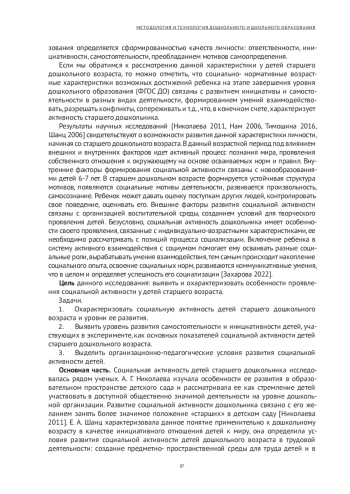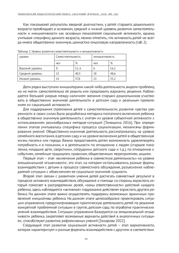 Социальная активность детей старшего дошкольного возраста рассматривается авторами в качестве инициативного отношения детей к социальным явлениям, содержание которых понятно и доступно детям, она характеризуется желанием детей принимать в них участие. На основе проведенного эксперимента авторами дана характеристика уровней развития социальной активности на основе сформированности самостоятельности и инициативности в коммуникативной, познавательной деятельности. Изучение самостоятельности и инициативности детей старшего дошкольного возраста показало, что преобладает средний уровень их развития. Дети редко выступают инициаторами какой-либо деятельности, не всегда могут самостоятельно довести начатое дело до конца. Виден большой разрыв между наличием желания старших дошкольников участвовать в общественно значимой деятельности в детском саду и умениями включения в эту деятельность. Предложена поэтапная работа по развитию социальной активности, предполагающая последовательность развития самостоятельности детей; определены необходимые для этого организационно- педагогические условия.