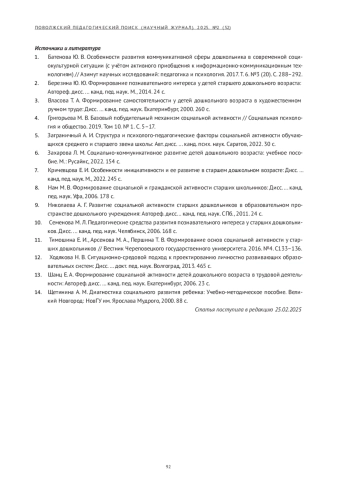 9. Николаева А. Г. Развитие социальной активности старших дошкольников в образовательном пространстве дошкольного учреждения: Автореф. дисс. канд. пед. наук. СПб., 2011. 24 с. EDN: QFUFEJ