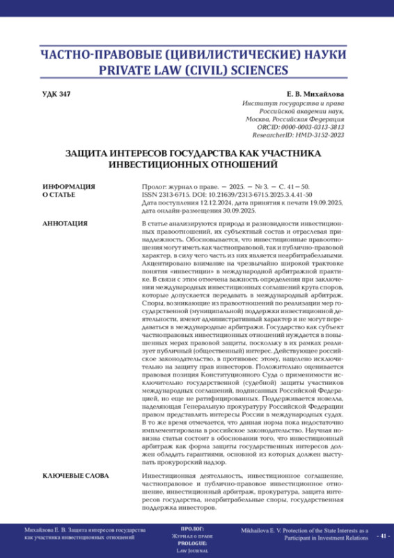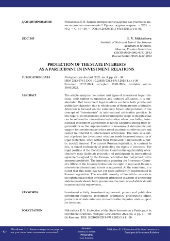 В статье анализируются природа и разновидности инвестиционных правоотношений, их субъектный состав и отраслевая принадлежность. Обосновывается, что инвестиционные правоотношения могут иметь как частноправовой, так и публично-правовой характер, в силу чего часть из них является неарбитрабельными. Акцентировано внимание на чрезвычайно широкой трактовке понятия «инвестиции» в международной арбитражной практике. В связи с этим отмечена важность определения при заключении международных инвестиционных соглашений круга споров, которые допускается передавать в международный арбитраж. Споры, возникающие из правоотношений по реализации мер государственной (муниципальной) поддержки инвестиционной деятельности, имеют административный характер и не могут передаваться в международные арбитражи. Государство как субъект частноправовых инвестиционных отношений нуждается в повышенных мерах правовой защиты, поскольку в их рамках реализует публичный (общественный) интерес. Действующее российское законодательство, в противовес этому, нацелено исключительно на защиту прав инвесторов. Положительно оценивается правовая позиция Конституционного Суда о применимости исключительно государственной (судебной) защиты участников международных соглашений, подписанных Российской Федерацией, но еще не ратифицированных. Поддерживается новелла, наделяющая Генеральную прокуратуру Российской Федерации правом представлять интересы России в международных судах. В то же время отмечается, что данная норма пока недостаточно имплементирована в российское законодательство. Научная новизна статьи состоит в обосновании того, что инвестиционный арбитраж как форма защиты государственных интересов должен обладать гарантиями, основной из которых должен выступать прокурорский надзор.