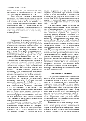 Yu. S. Akishev, А. V. Petryakov, N. I. Trushkin, and V. A. Ustyugov Improvement of adhesion of polyurethane foam to the low pressure polyethylene processed by a plasma jet at the atmospheric pressure 20