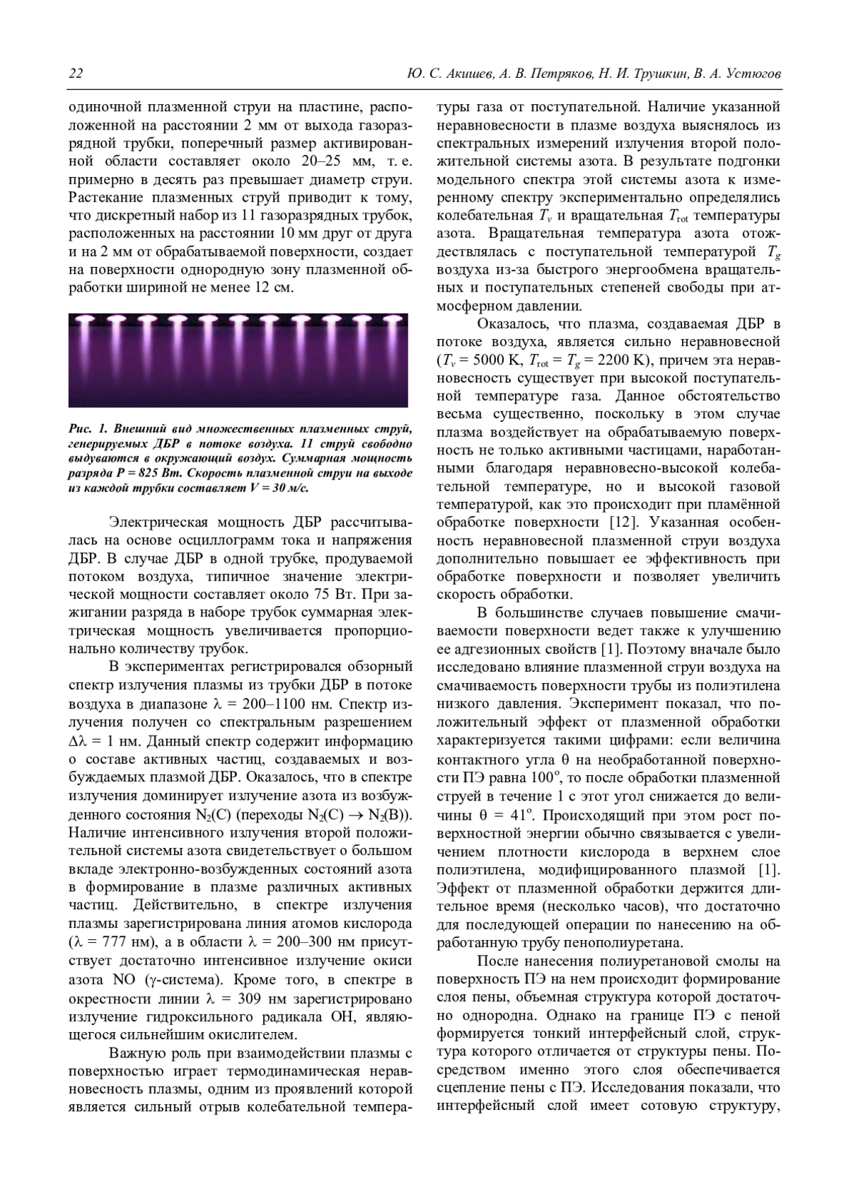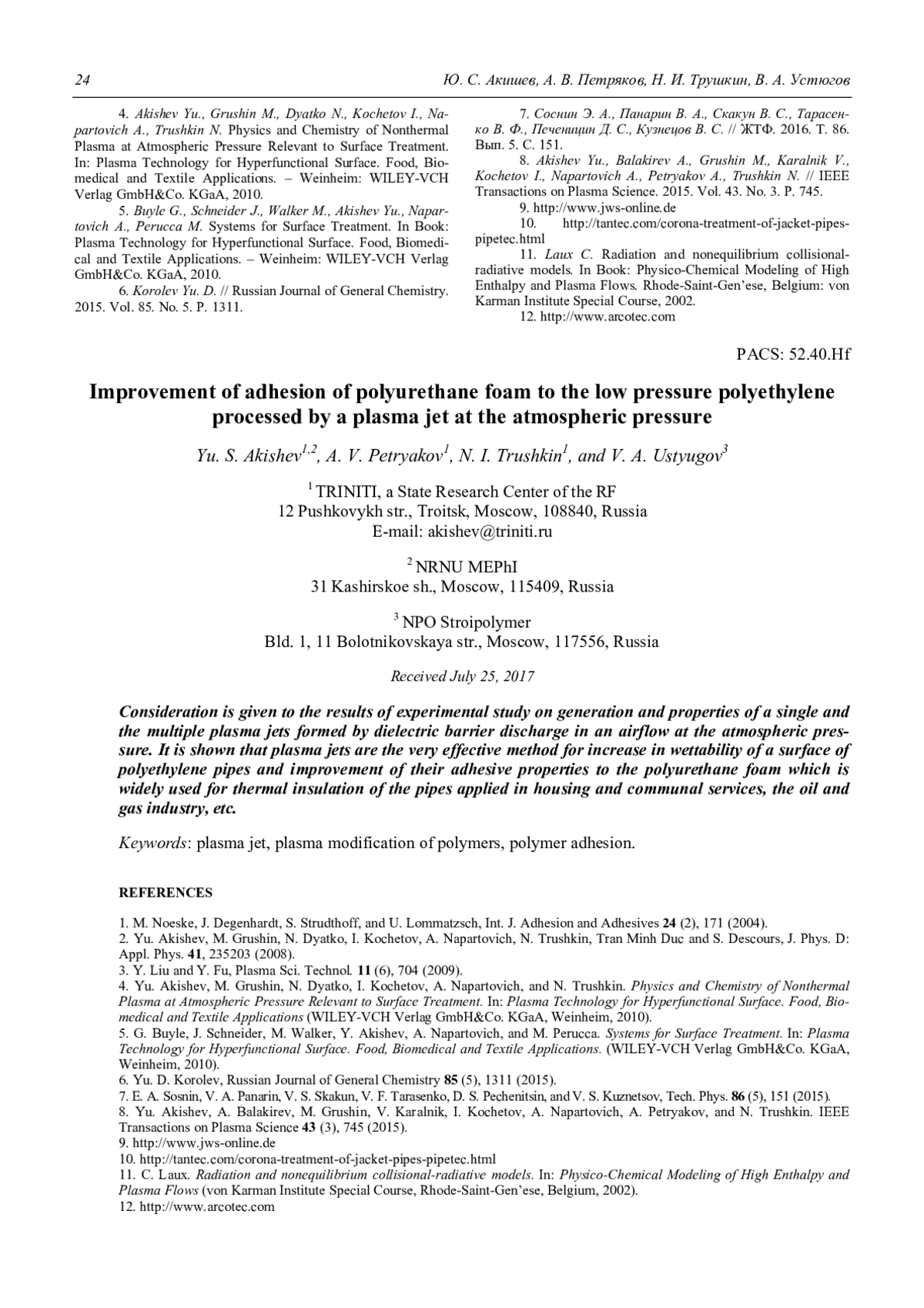 Акишев Ю. С., Петряков А. В., Трушкин Н. И., Устюгов В. А. Улучшение адгезии пенополиуретана к полиэтилену низкого давления, обработанному плазменной струей при атмосферном давлении 20