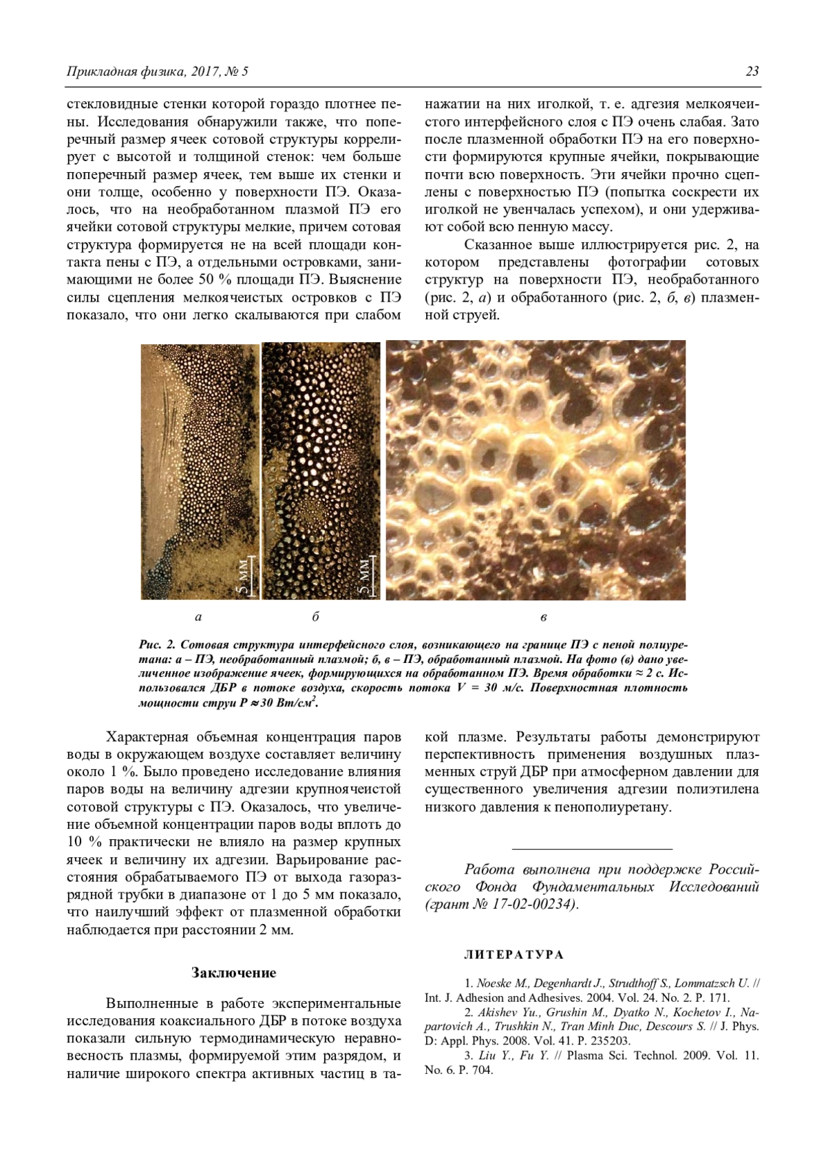 Выполненные в работе экспериментальные исследования коаксиального ДБР в потоке воздуха показали сильную термодинамическую неравновесность плазмы, формируемой этим разрядом, и наличие широкого спектра активных частиц в такой плазме. Результаты работы демонстрируют перспективность применения воздушных плазменных струй ДБР при атмосферном давлении для существенного увеличения адгезии полиэтилена низкого давления к пенополиуретану.
