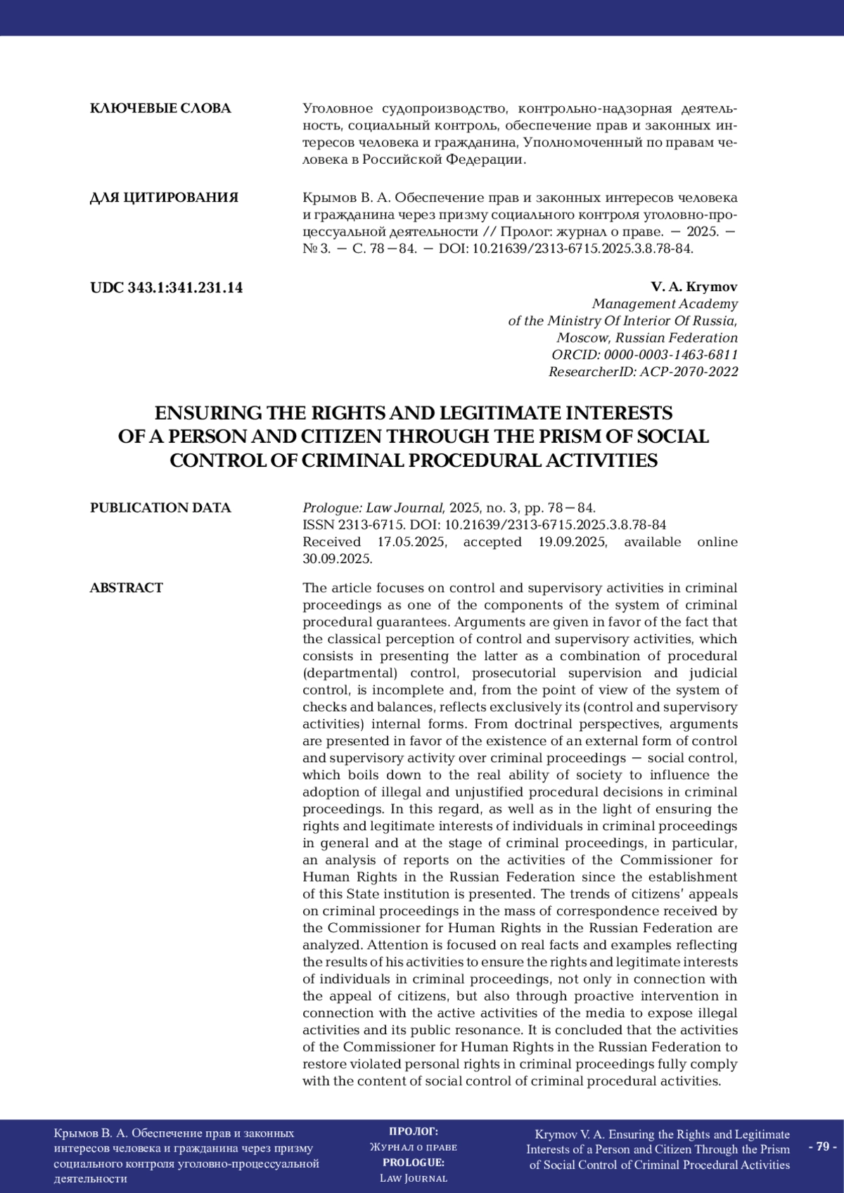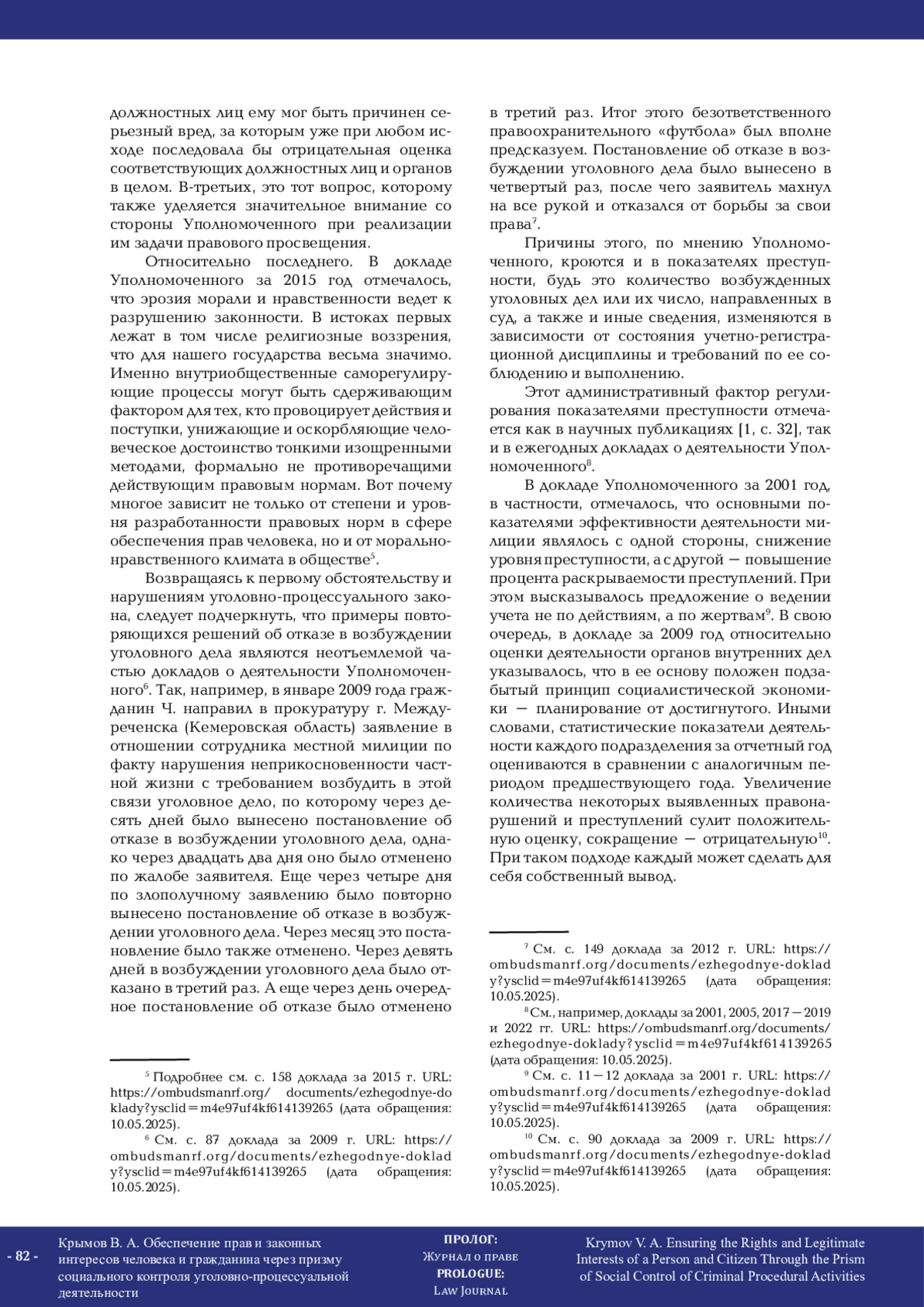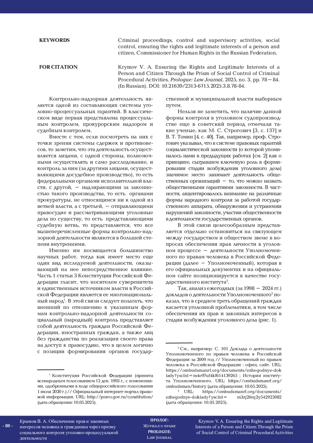 В статье сфокусировано внимание на контрольно-надзорной деятельности в уголовном судопроизводстве как одной из составляющих системы уголовно-процессуальных гарантий. Приводятся доводы в пользу того, что классическое восприятие контрольно-надзорной деятельности, заключающееся в представлении последней как совокупности процессуального (ведомственного) контроля, прокурорского надзора и судебного контроля, является неполным и с точки зрения системы сдержек и противовесов отражает исключительно ее (контрольнонадзорной деятельности) внутренние формы. С доктринальных воззрений приводятся аргументы в пользу существования внешней формы контрольно-надзорной деятельности за уголовным судопроизводством – социального контроля, который сводится к реальной возможности общества влиять на принятие незаконных и необоснованных процессуальных решений при производстве по уголовному делу. В этой связи, а также в свете обеспечения прав и законных интересов личности в уголовном судопроизводстве в целом и в стадии возбуждения уголовного дела в частности представлен анализ докладов о деятельности Уполномоченного по правам человека в Российской Федерации с момента создания этого государственного института. Проанализированы тенденции обращений граждан по вопросам уголовного судопроизводства в массиве поступающей в адрес Уполномоченного по правам человека в Российской Федерации корреспонденции. Акцентировано внимание на реальных фактах и примерах, отражающих результаты его деятельности по обеспечению прав и законных интересов личности в уголовном судопроизводстве не только в связи с обращением граждан, но и посредством инициативного вмешательства в связи с активной деятельностью средств массовой информации по изобличению противоправной деятельности и ее общественным резонансом. Сделан вывод о том, что деятельность Уполномоченного по правам человека в Российской Федерации по восстановлению нарушенных прав личности в уголовном процессе в полной мере отвечает содержанию социального контроля уголовно-процессуальной деятельности.