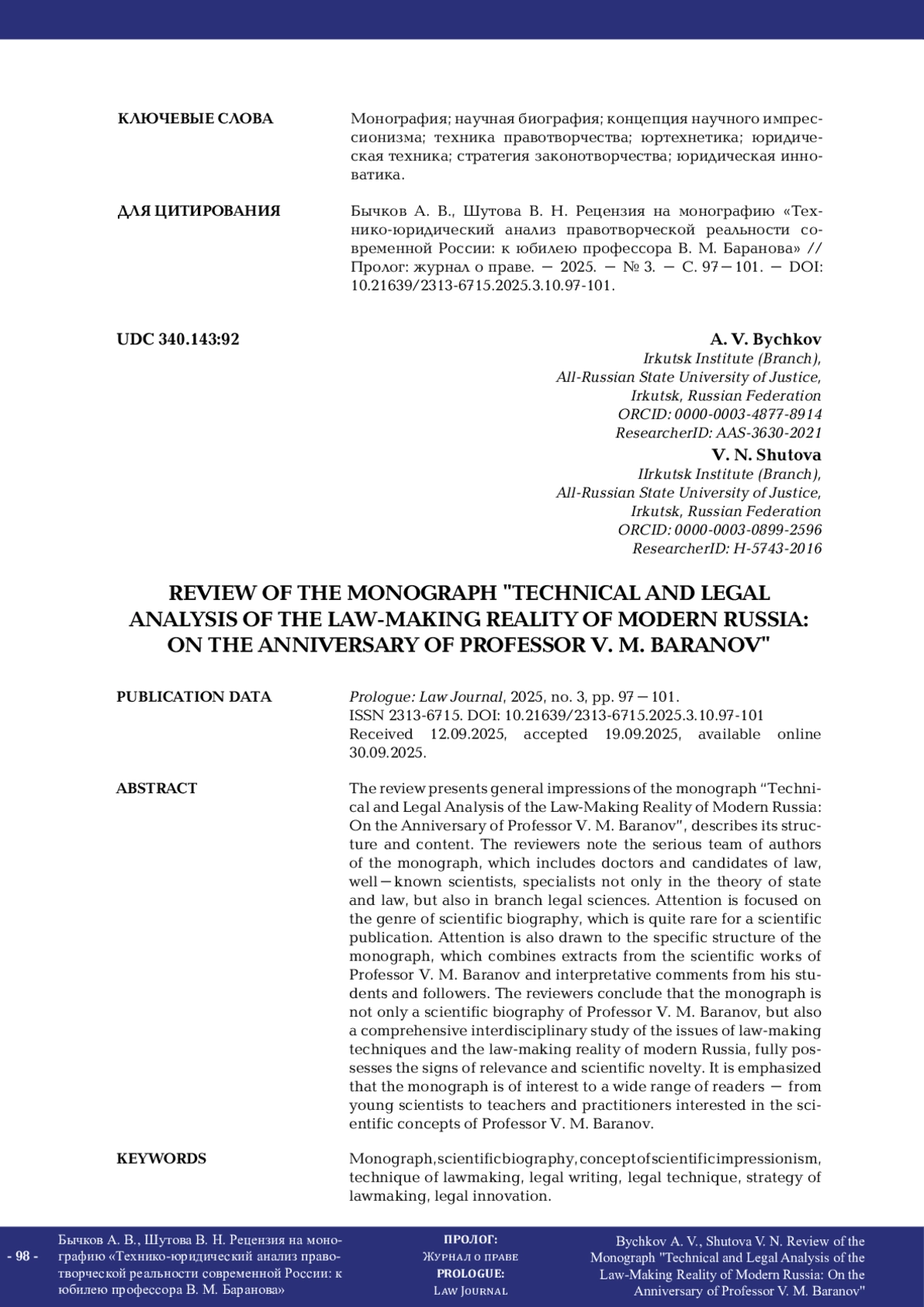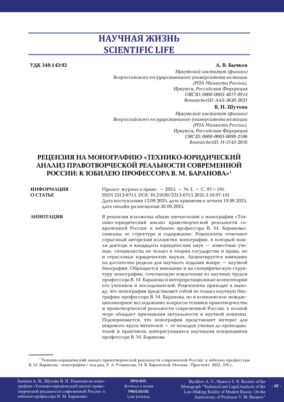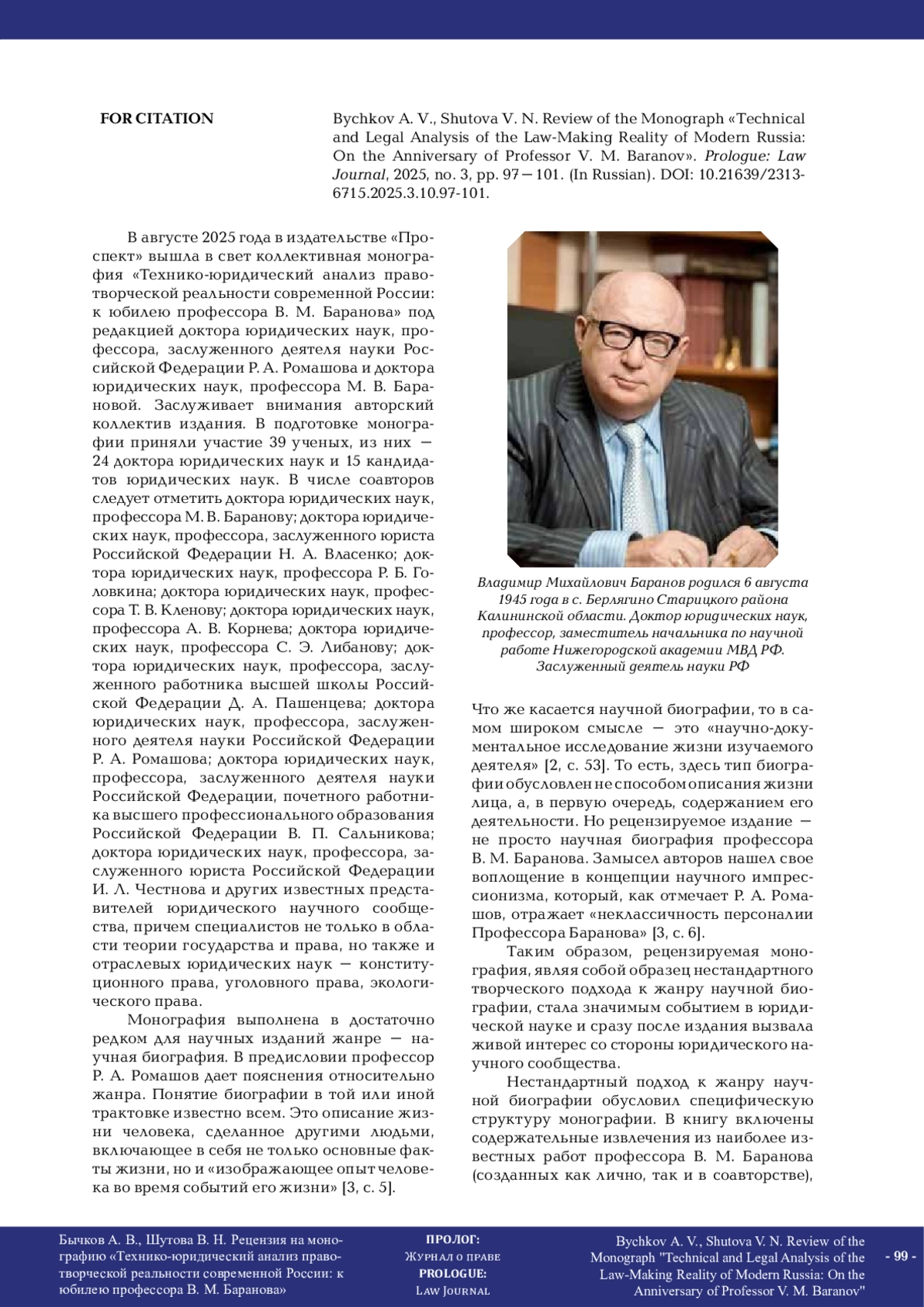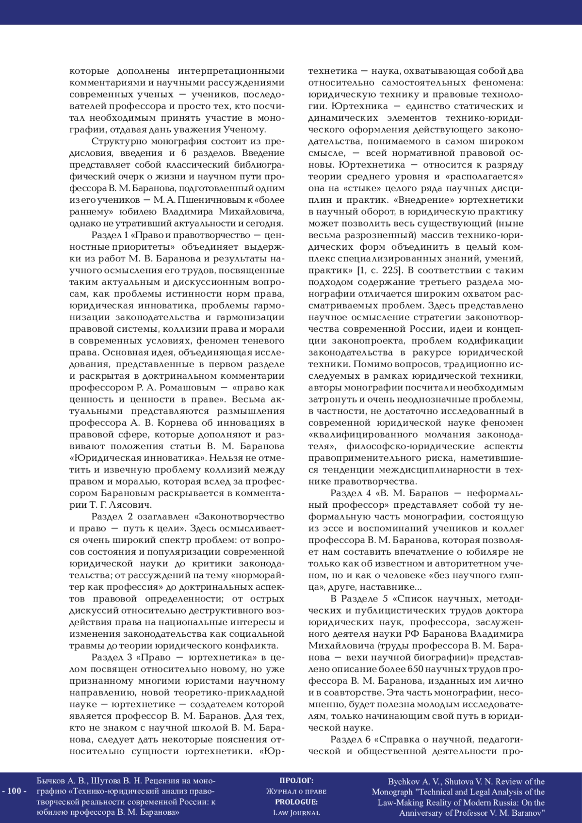 В рецензии изложены общие впечатления о монографии «Технико-юридический анализ правотворческой реальности современной России: к юбилею профессора В. М. Баранова», описаны ее структура и содержание. Рецензенты отмечают серьезный авторский коллектив монографии, в который вошли доктора и кандидаты юридических наук – известные ученые, специалисты не только в теории государства и права, но и отраслевых юридических науках. Акцентируется внимание на достаточно редком для научного издания жанре – научной биографии. Обращается внимание и на специфическую структуру монографии, сочетающую извлечения из научных трудов профессора В. М. Баранова и интерпретационные комментарии его учеников и последователей. Рецензенты приходят к выводу, что монография представляет собой не только научную биографию профессора В. М. Баранова, но и комплексное междисциплинарное исследование вопросов техники правотворчества и правотворческой реальности современной России, в полной мере обладает признаками актуальности и научной новизны. Подчеркивается, что монография представляет интерес для широкого круга читателей – от молодых ученых до преподавателей и практиков, интересующихся научными концепциями профессора В. М. Баранова.