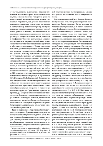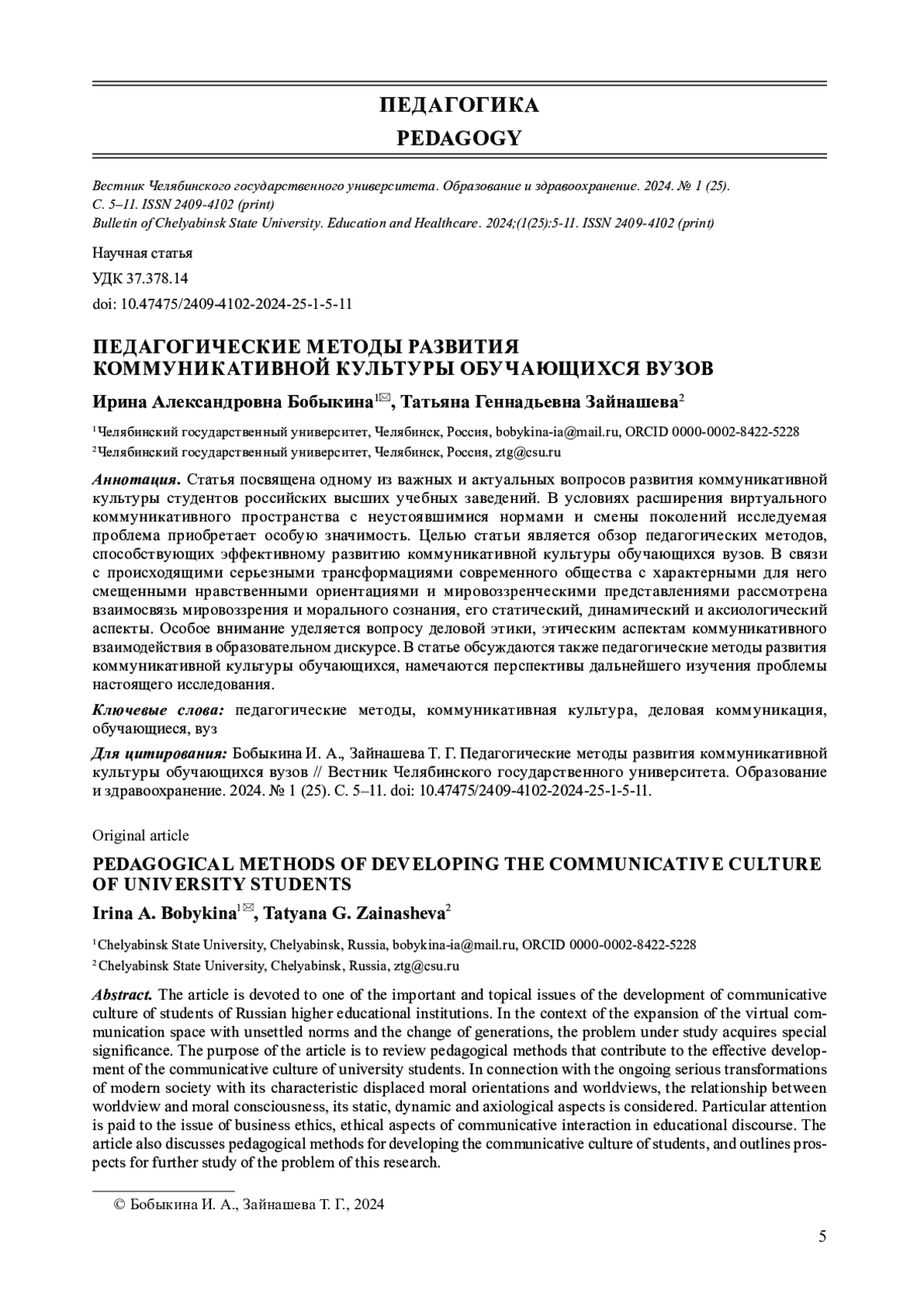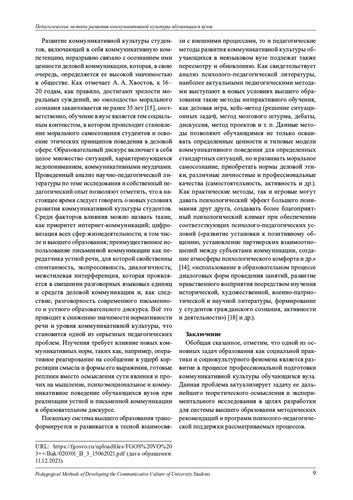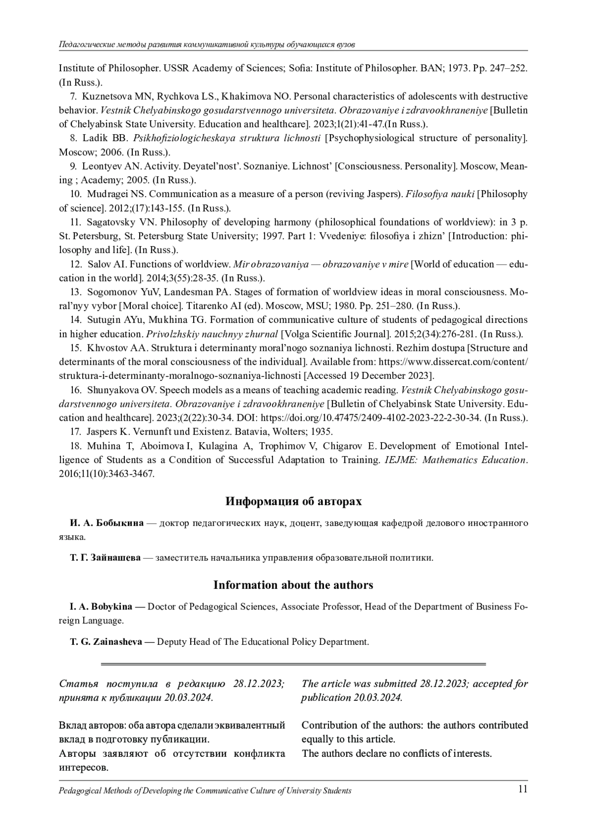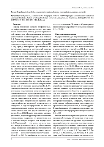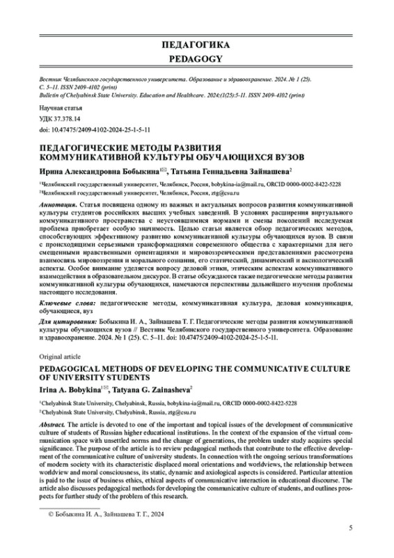 Статья посвящена одному из важных и актуальных вопросов развития коммуникативной культуры студентов российских высших учебных заведений. В условиях расширения виртуального коммуникативного пространства с неустоявшимися нормами и смены поколений исследуемая проблема приобретает особую значимость. Целью статьи является обзор педагогических методов, способствующих эффективному развитию коммуникативной культуры обучающихся вузов. В связи с происходящими серьезными трансформациями современного общества с характерными для него смещенными нравственными ориентациями и мировоззренческими представлениями рассмотрена взаимосвязь мировоззрения и морального сознания, его статический, динамический и аксиологический аспекты. Особое внимание уделяется вопросу деловой этики, этическим аспектам коммуникативного взаимодействия в образовательном дискурсе. В статье обсуждаются также педагогические методы развития коммуникативной культуры обучающихся, намечаются перспективы дальнейшего изучения проблемы настоящего исследования.
