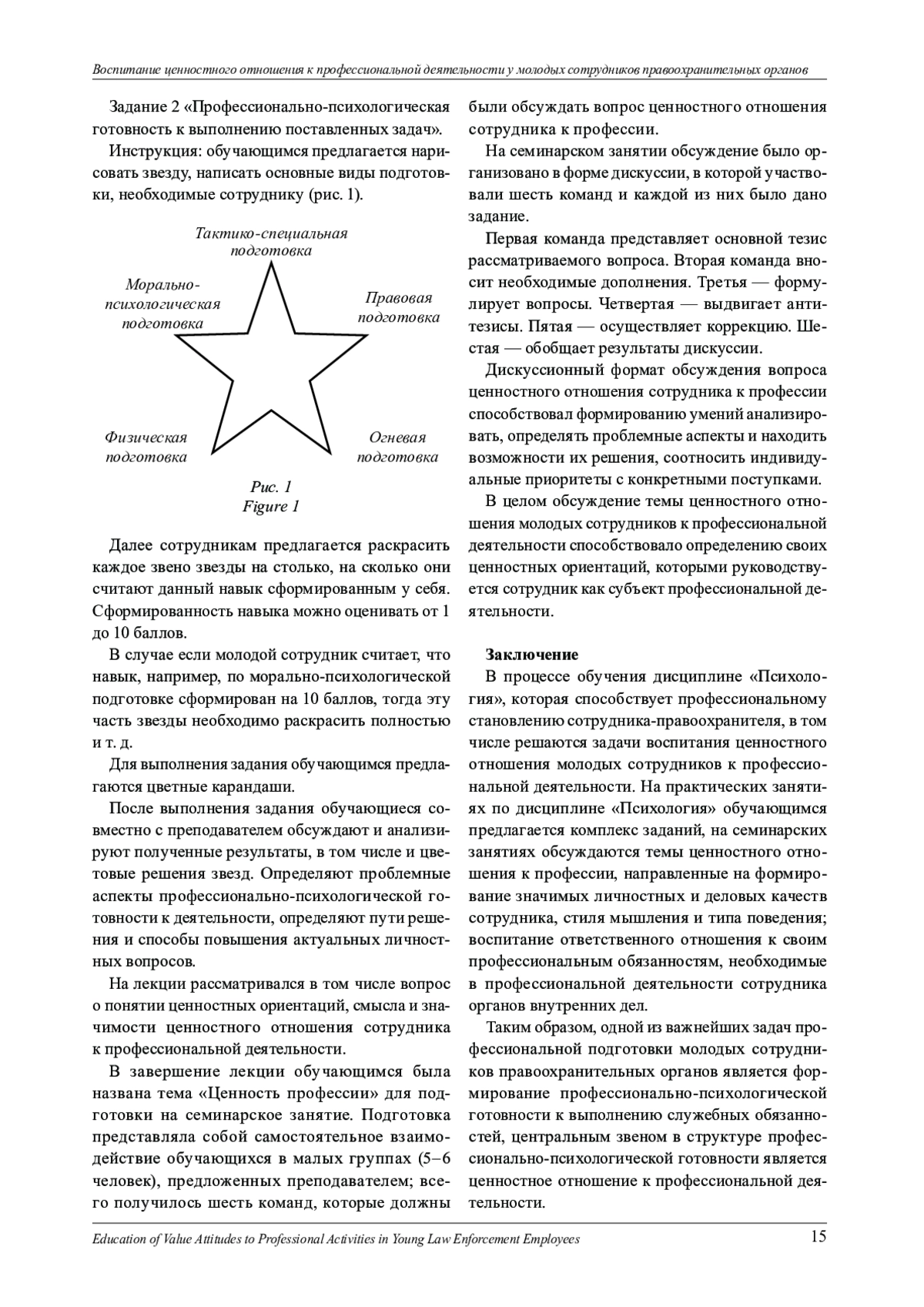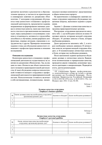 Обсуждается одна из значимых тем в подготовке молодых сотрудников правоохранительных органов, а именно воспитание ценностного отношения к профессиональной деятельности. Автор обращает особое внимание на реализацию аспектов воспитания ценностного отношения к профессиональной деятельности в процессе обучения молодых сотрудников органов внутренних дел. Предлагается опыт проведения комплекса письменных заданий на практических занятиях и варианты актуальных вопросов (тем) для обсуждения на семинарских занятиях по дисциплине «Психология». Раскрывается содержание заданий и упражнений, направленных на воспитание ценностного отношения к профессиональной деятельности, осознание необходимости получения профессиональных знаний, умений и навыков в период профессионального становления как значимого фактора в формировании, воспитании мастерства, деловых и личностных качеств сотрудника правоохранительных органов, его готовности выполнять сложные профессиональные задачи в разных условиях и обстоятельствах службы.