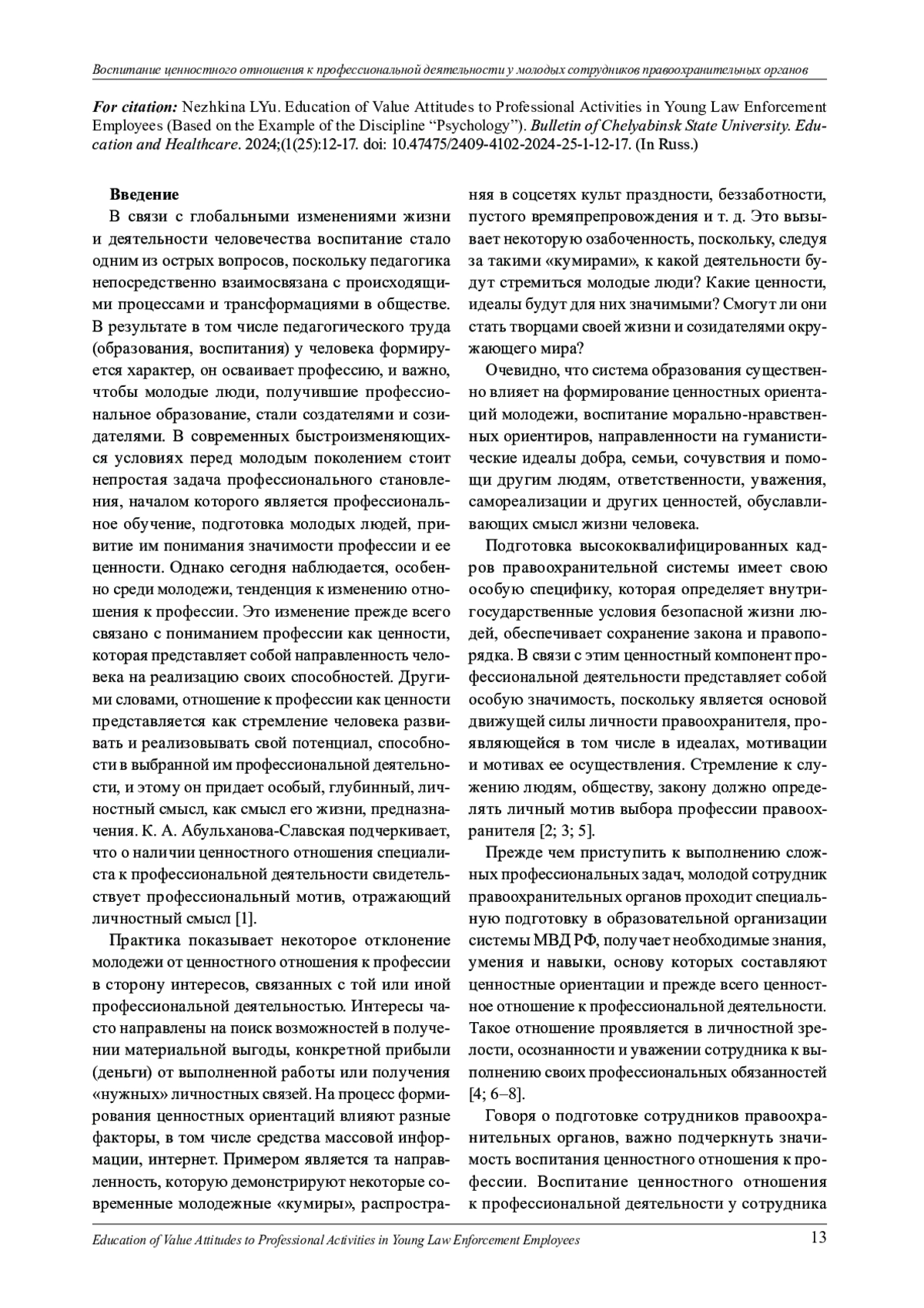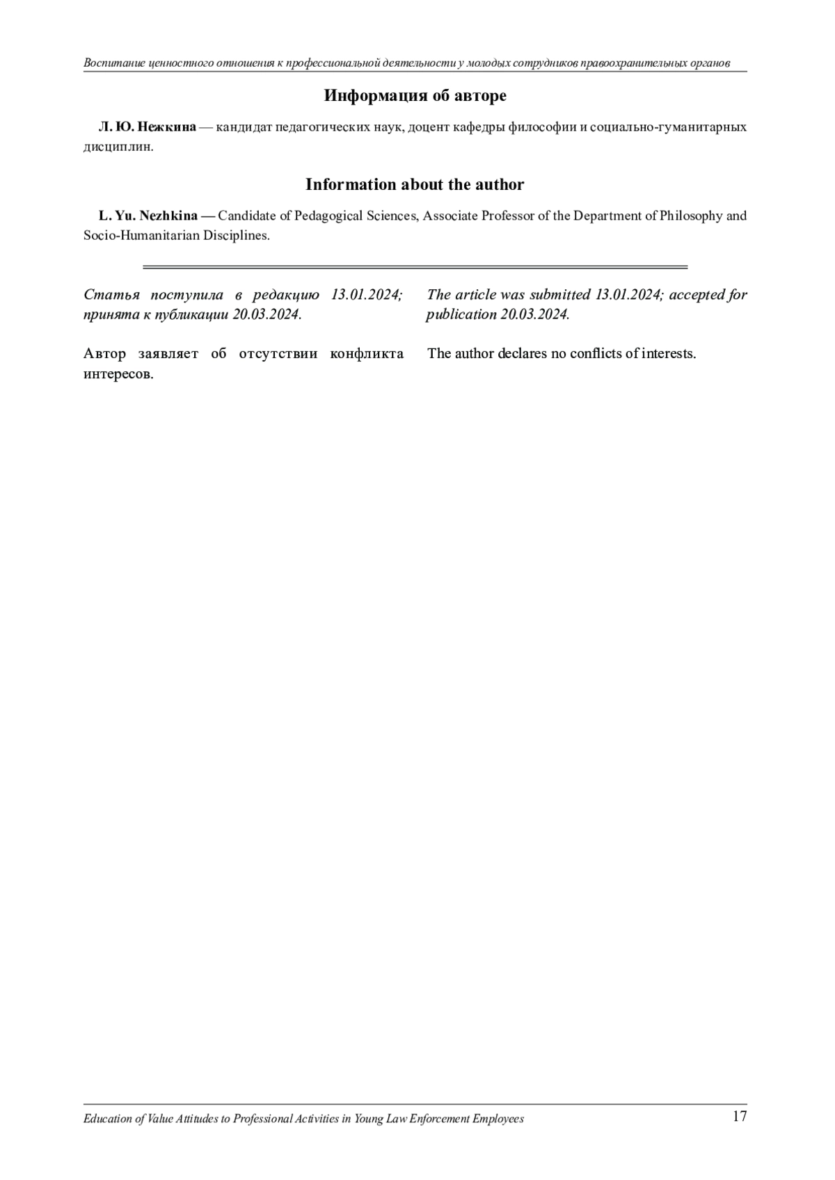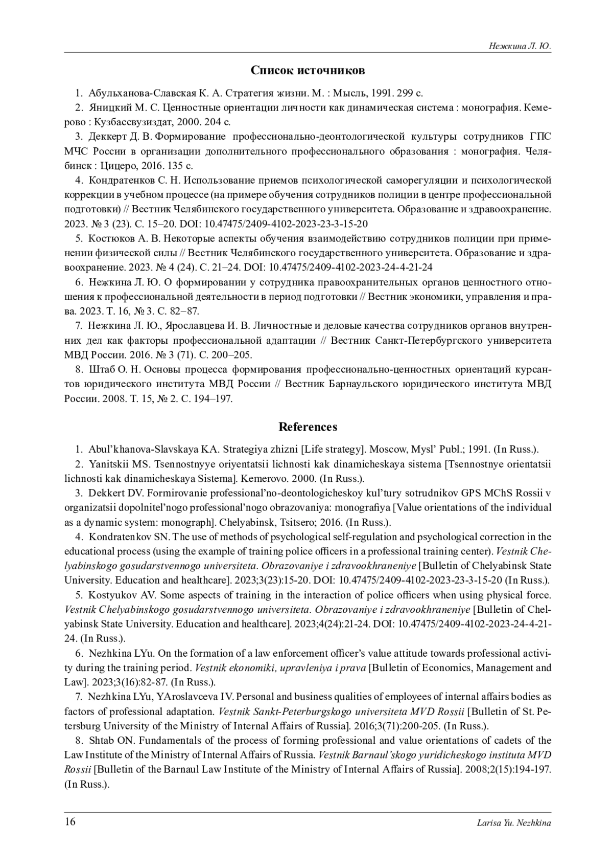 6. Нежкина Л. Ю. О формировании у сотрудника правоохранительных органов ценностного отношения к профессиональной деятельности в период подготовки // Вестник экономики, управления и права. 2023. Т. 16, № 3. С. 82-87. EDN: FBENWJ