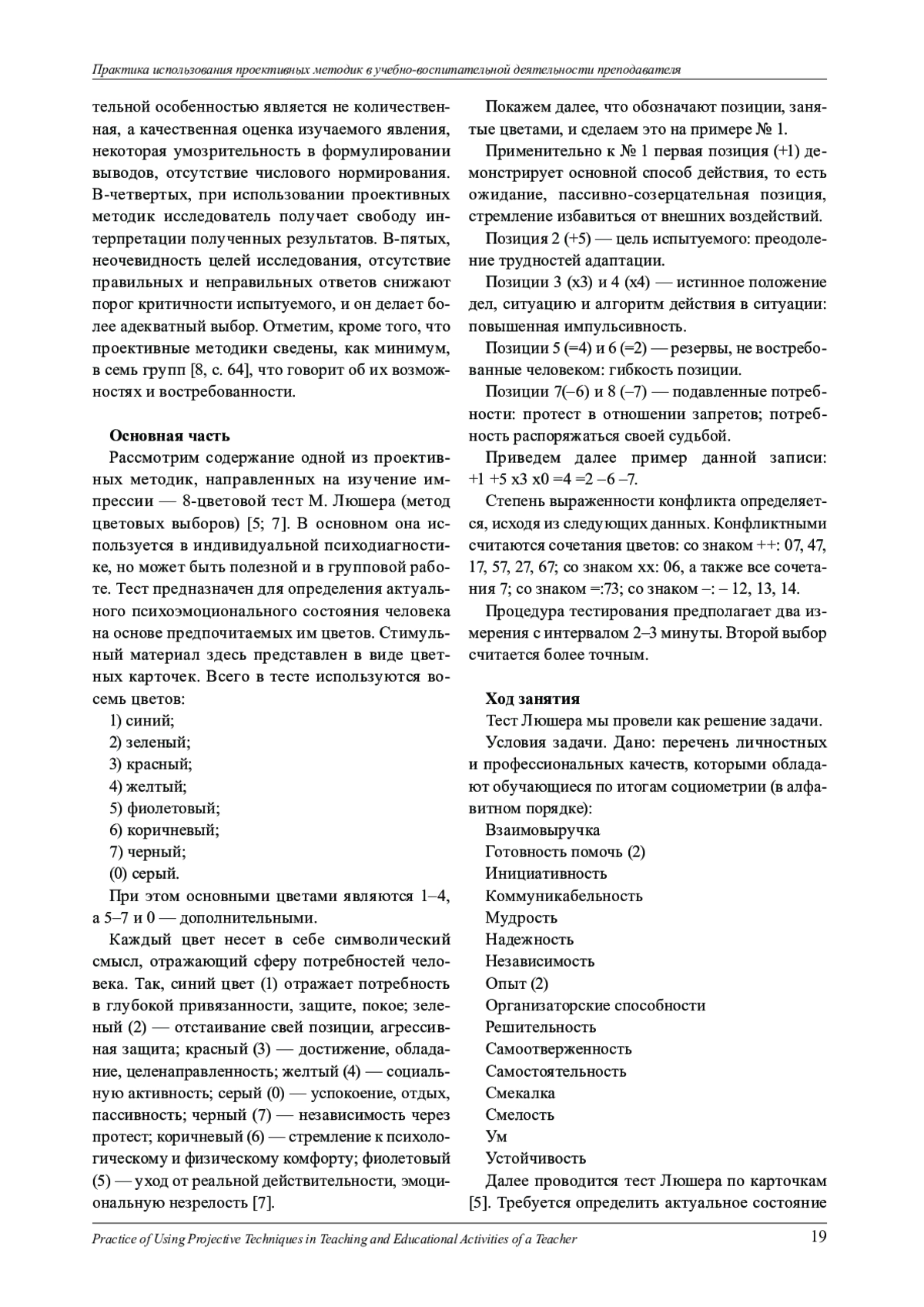 Статья посвящена актуальной теме использования в учебно-воспитательном процессе проективных методик. На примере восьмицветового теста Люшера автор рассматривает организационные и содержательные проблемы его использования в практической деятельности педагога. Показано, что тест Люшера коррелирует с большинством других методик, в частности с социометрией. Автор предлагает ряд рекомендаций преподавательскому составу по использованию потенциала теста Люшера в целях изучения обучающихся.