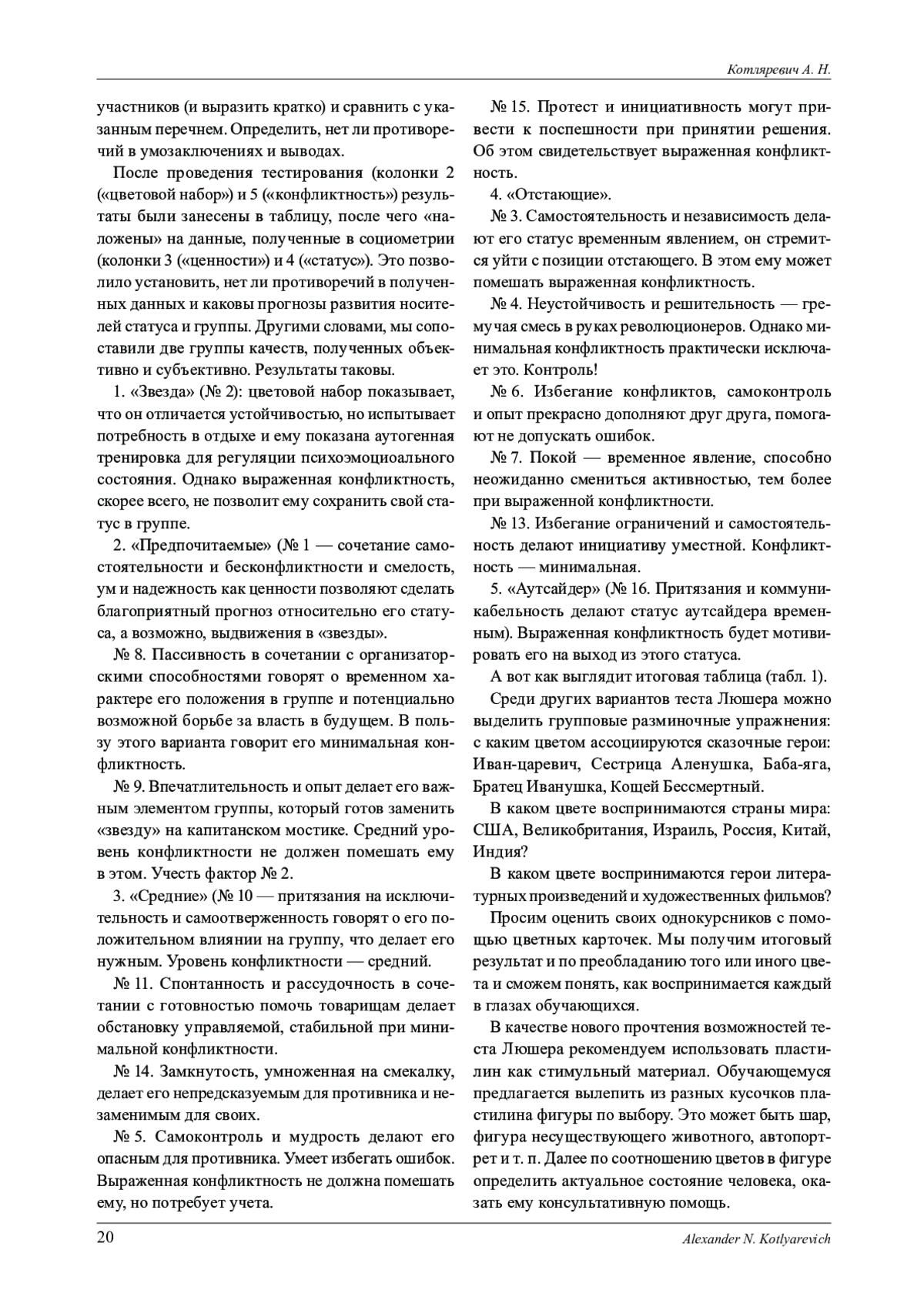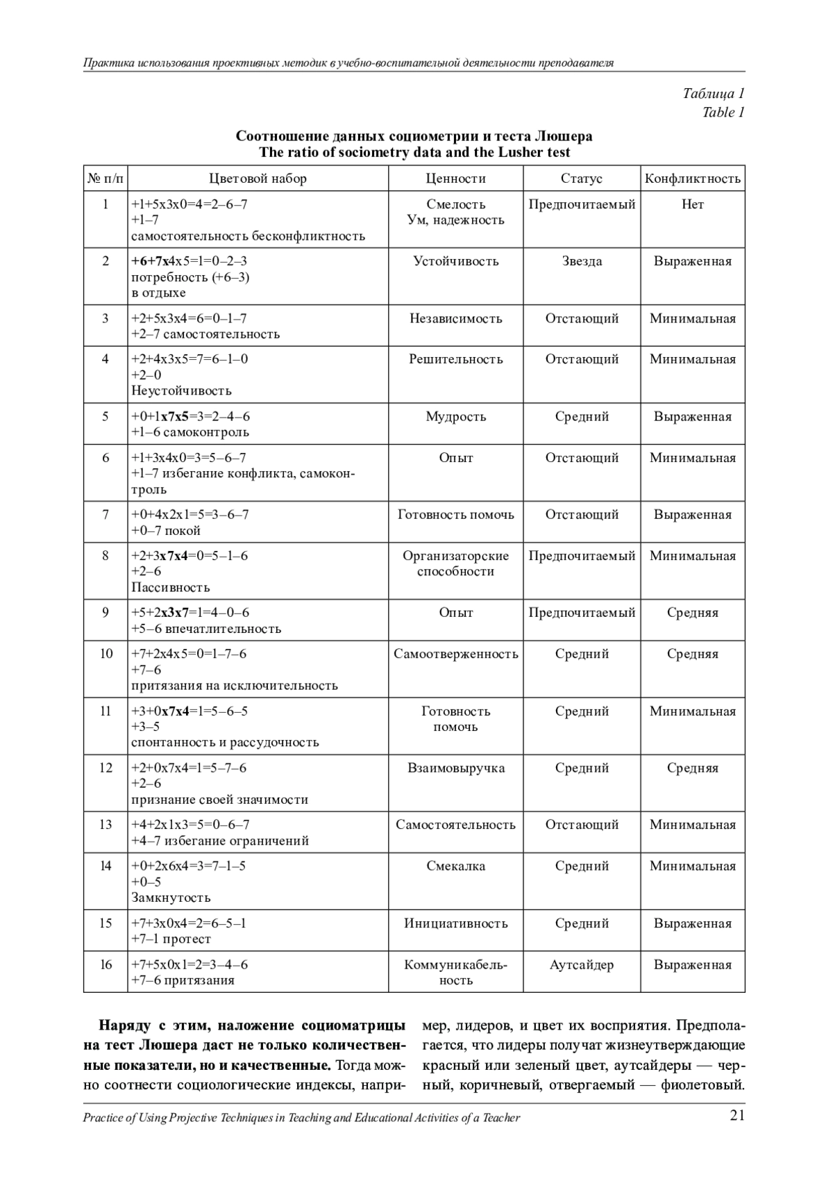 После проведения тестирования (колонки 2 («цветовой набор») и 5 («конфликтность») результаты были занесены в таблицу, после чего «наложены» на данные, полученные в социометрии (колонки 3 («ценности») и 4 («статус»). Это позволило установить, нет ли противоречий в полученных данных и каковы прогнозы развития носителей статуса и группы. Другими словами, мы сопоставили две группы качеств, полученных объективно и субъективно. Результаты таковы.