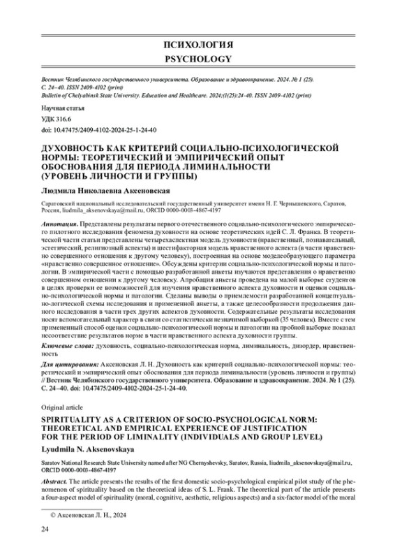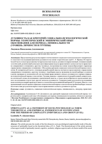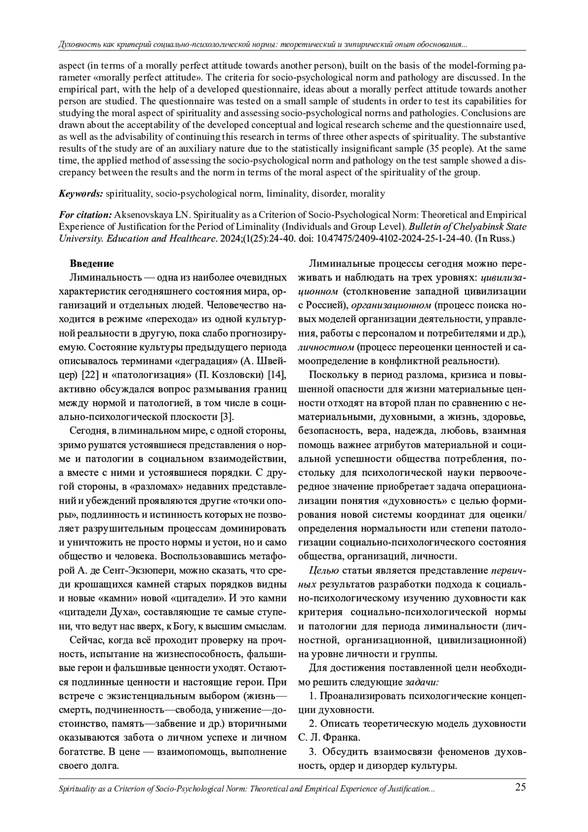 2. Аксеновская Л. Н. Духовность как критерий социально-психологической нормы: опыт обоснования для периода лиминальности (цивилизационной, организационной, личностной) // Личность в норме и патологии: материалы Международной научно-практической конференции, Челябинск, 20-21 апреля 2023 г. / под ред. И. А. Трушиной. Челябинск: Издательство Челяб. гос. ун-та, 2023. С. 19-23. EDN: XKACWI
