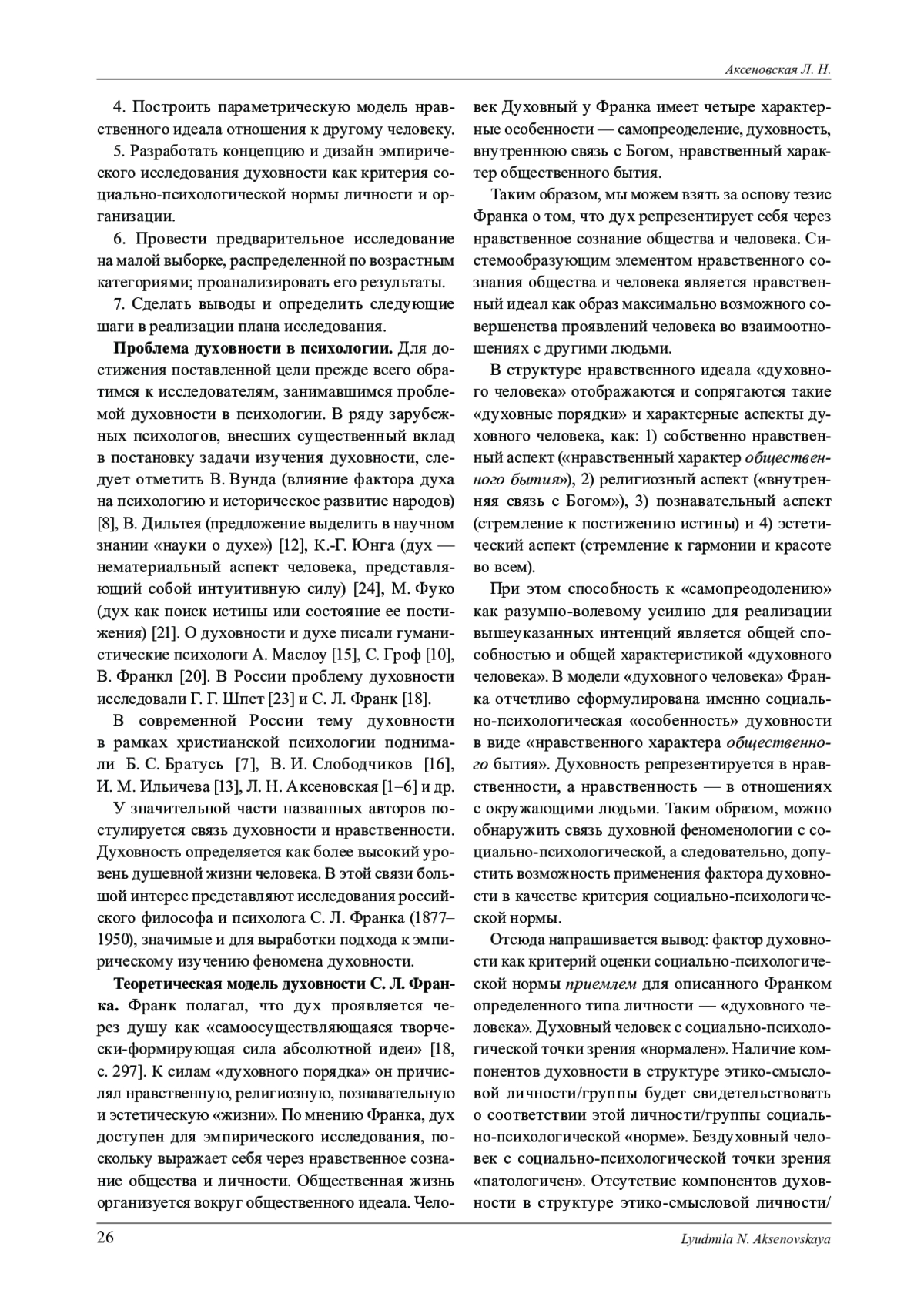 6. Аксеновская Л. Н. Проект духовной психологии С. Л. Франка: перспективы реализации и развития в контексте ордерного подхода // После постпозитивизма: сборник научных статей / науч. ред. и сост. И. Т. Касавин, И. Д. Невважай, Л. В. Шиповалова, Д. С. Артамонов. М.: Русское общество истории и философии науки, 2022. С. 228-230. URL: http://rshps.ru/books/congress2022.pdf (дата обращения 10.10.2023). EDN: WAPTDB