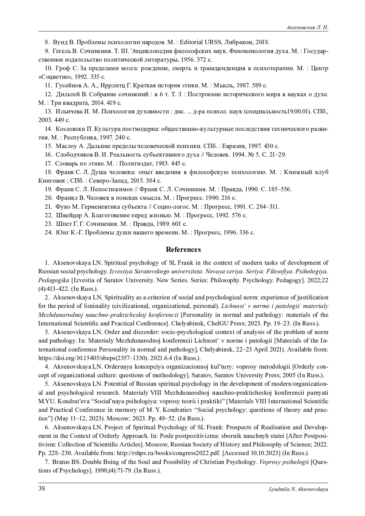 1. Аксеновская Л. Н. Духовная психология С. Л. Франка в контексте современных задач развития россий ской социальной психологии // Известия Саратовского университета. Новая серия. Серия: Философия. Психология. Педагогика. 2022. Т. 22, вып. 4. С. 413-422. EDN: ZMYDAN