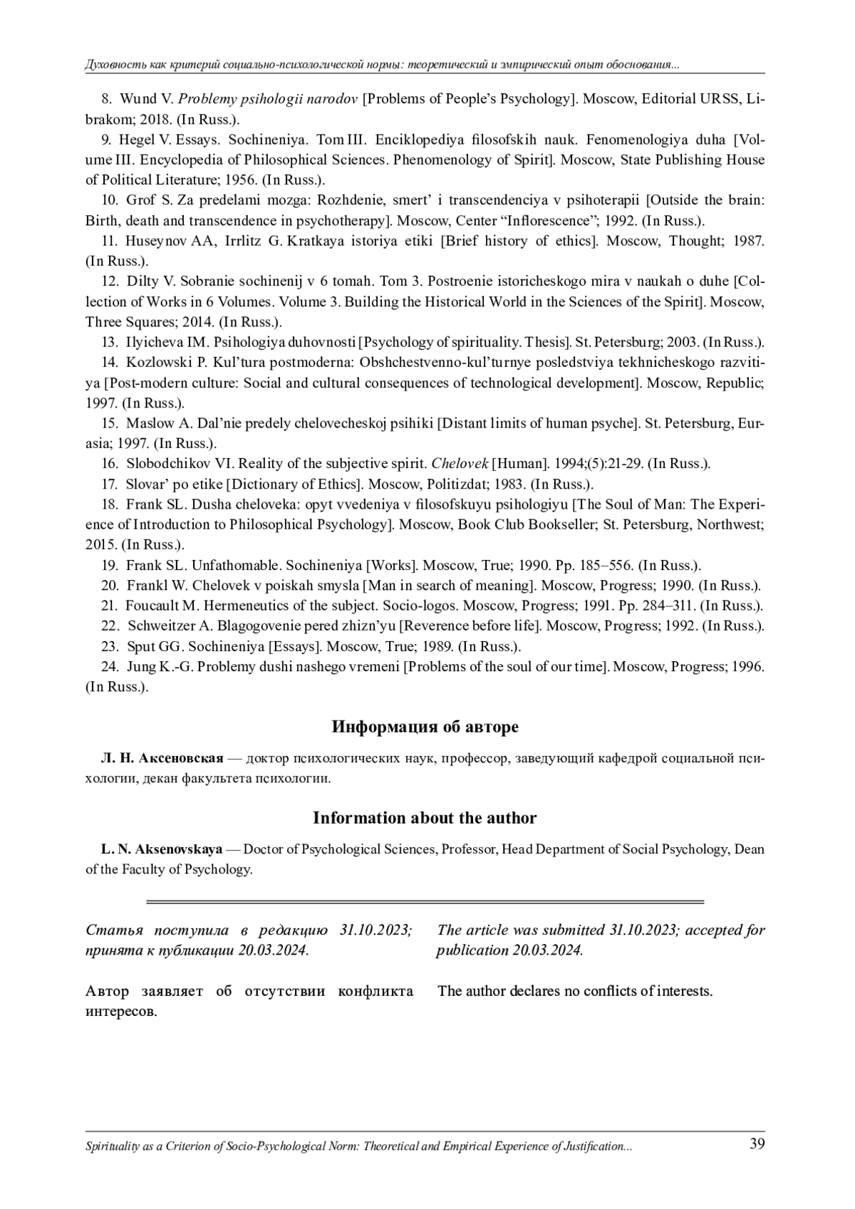7. Братусь Б. С. Двойное бытие души и возможность христианской психологии // Вопросы психологии. 1998. № 4. С. 71-79. Аксеновская Л. Н. Lyudmila N. Aksenovskaya38.