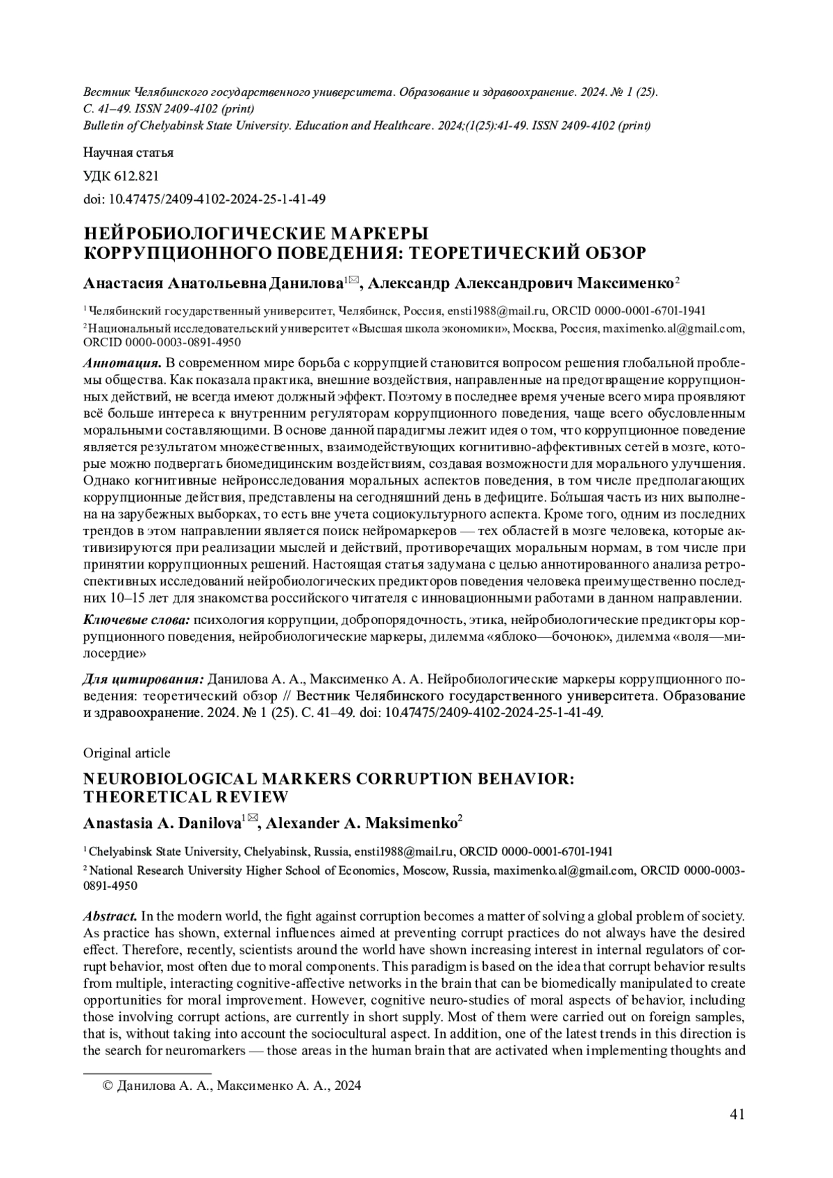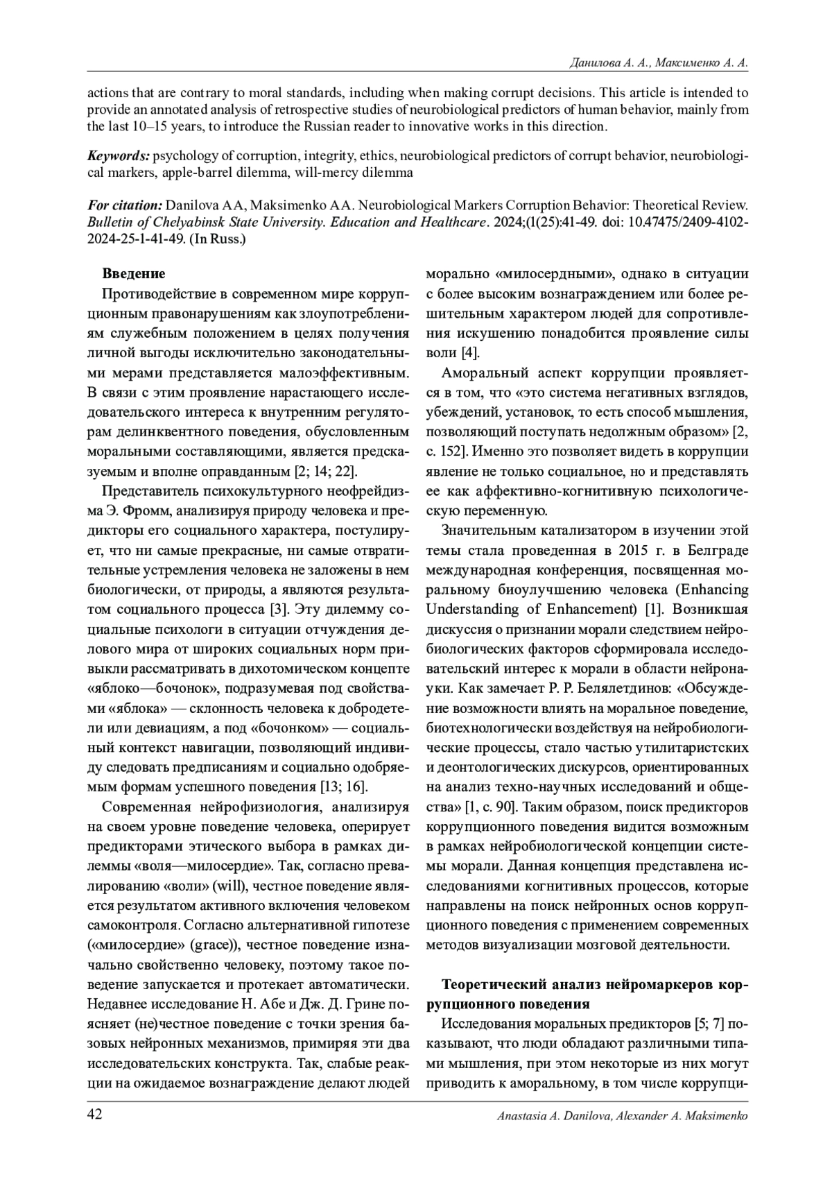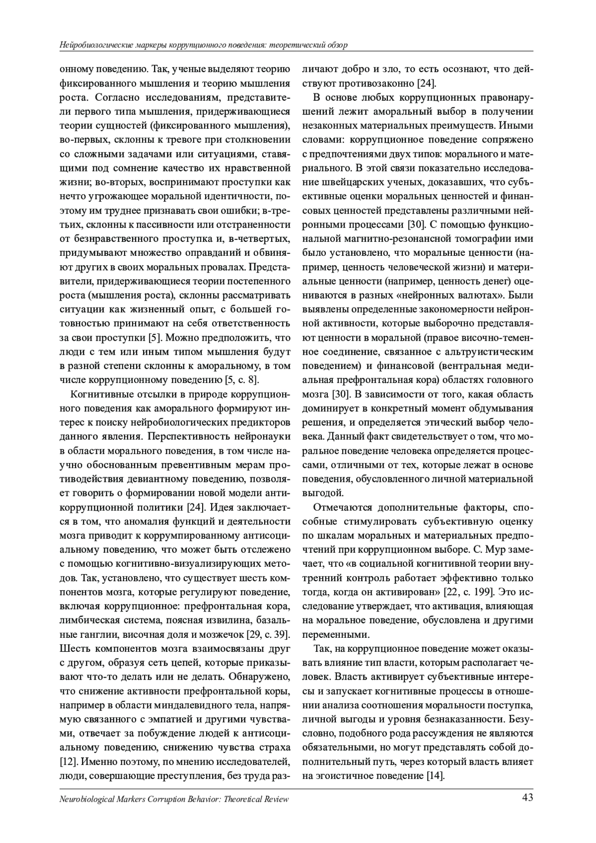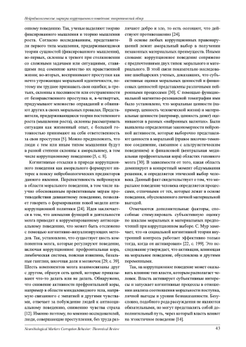 В современном мире борьба с коррупцией становится вопросом решения глобальной проблемы общества. Как показала практика, внешние воздействия, направленные на предотвращение коррупционных действий, не всегда имеют должный эффект. Поэтому в последнее время ученые всего мира проявляют всё больше интереса к внутренним регуляторам коррупционного поведения, чаще всего обусловленным моральными составляющими. В основе данной парадигмы лежит идея о том, что коррупционное поведение является результатом множественных, взаимодействующих когнитивно-аффективных сетей в мозге, которые можно подвергать биомедицинским воздействиям, создавая возможности для морального улучшения. Однако когнитивные нейроисследования моральных аспектов поведения, в том числе предполагающих коррупционные действия, представлены на сегодняшний день в дефиците. Бол́ьшая часть из них выполнена на зарубежных выборках, то есть вне учета социокультурного аспекта. Кроме того, одним из последних трендов в этом направлении является поиск нейромаркеров - тех областей в мозге человека, которые активизируются при реализации мыслей и действий, противоречащих моральным нормам, в том числе при принятии коррупционных решений. Настоящая статья задумана с целью аннотированного анализа ретроспективных исследований нейробиологических предикторов поведения человека преимущественно последних 10-15 лет для знакомства российского читателя с инновационными работами в данном направлении.