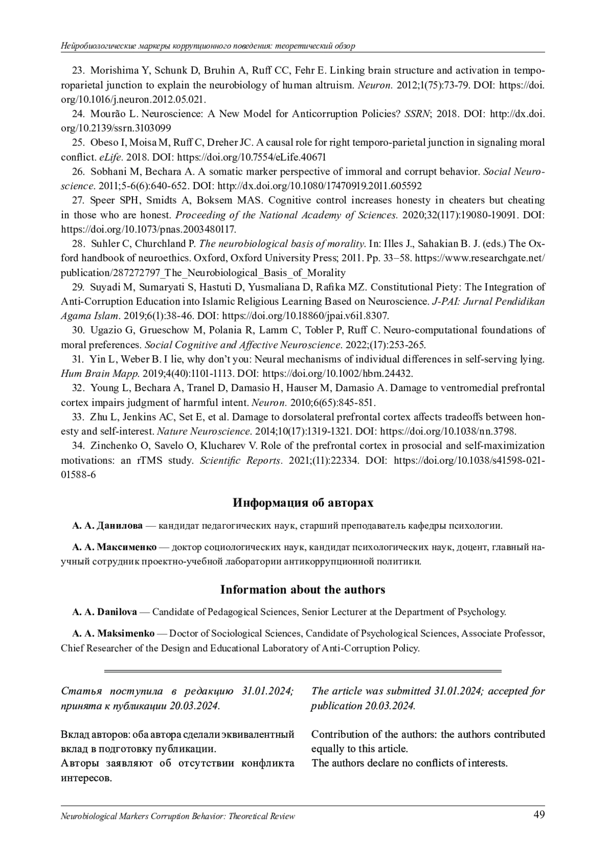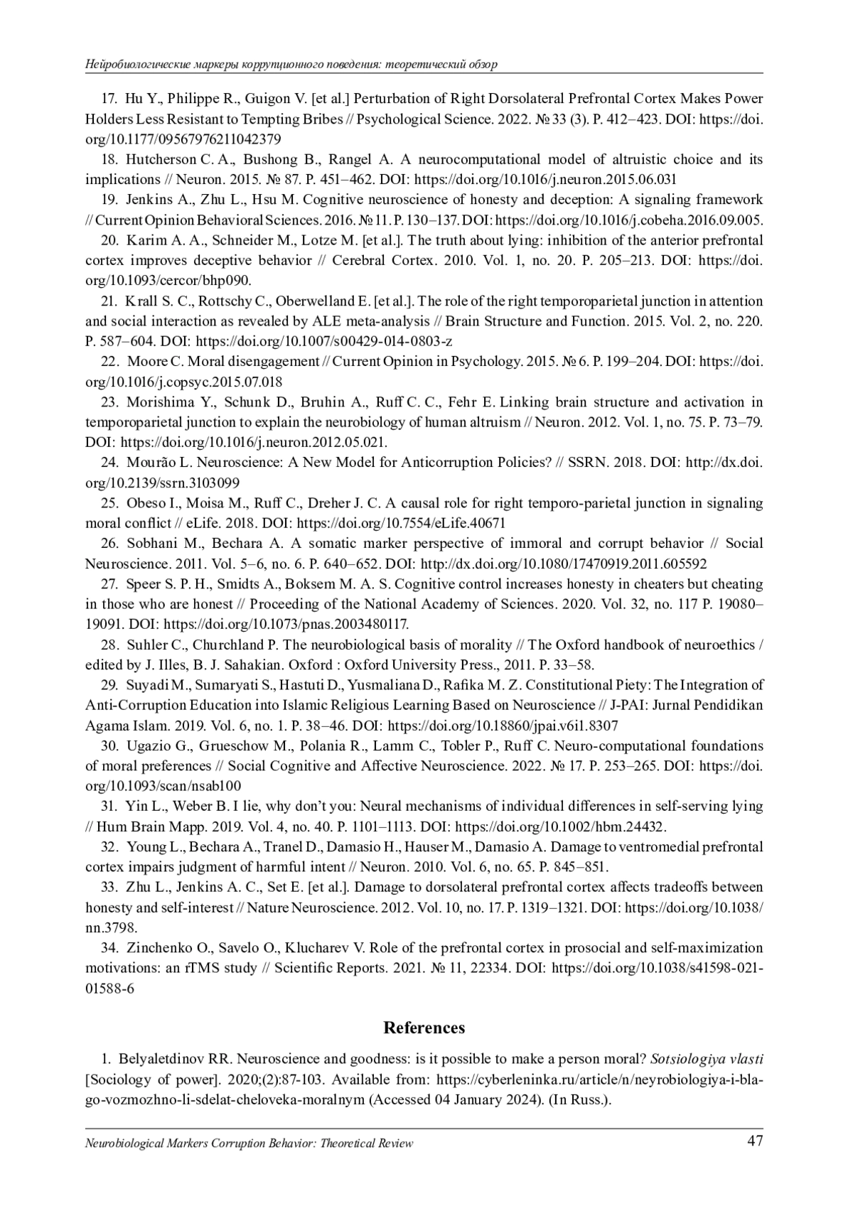 34. Zinchenko O., Savelo O., Klucharev V. Role of the prefrontal cortex in prosocial and self-maximization motivations: an rTMS study // Scientifi c Reports. 2021. № 11, 22334. 10.1038/s41598-021- 01588-6. DOI: 10.1038/s41598-021-01588-6 EDN: PFIIPN