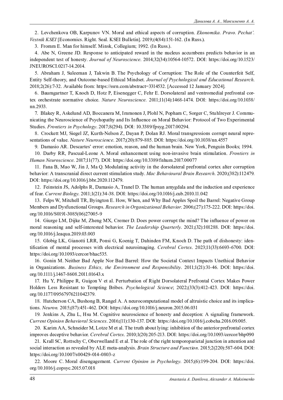 11. Fana B., Maod W., Jinc J., Ma Q. Modulating activity in the dorsolateral prefrontal cortex alter corruption behavior: A transcranial direct current stimulation study // Mac Behavioural Brain Research. 2020. № 382, 112479. DOI: 10.1016/j.bbr.2020.112479