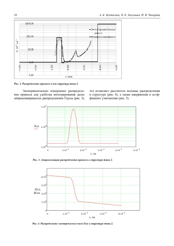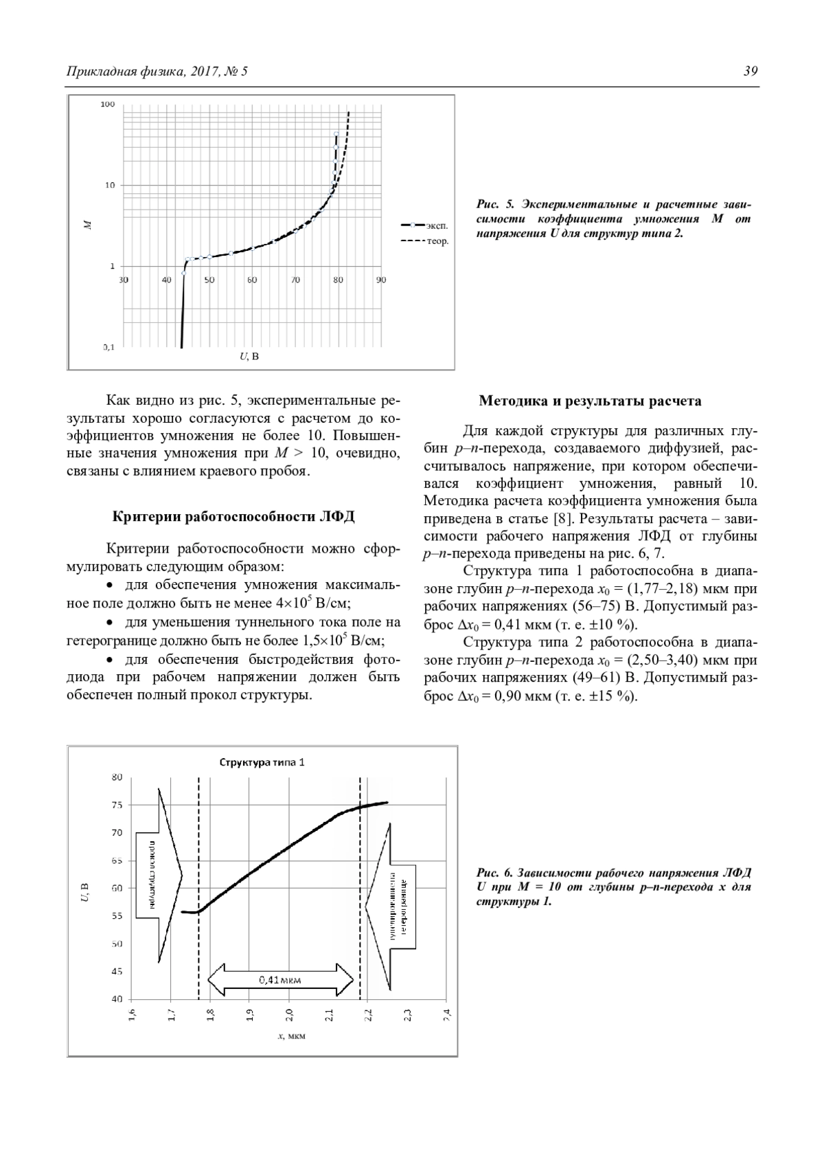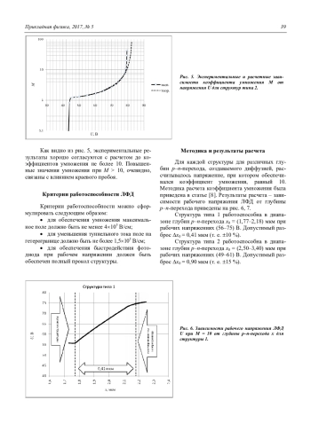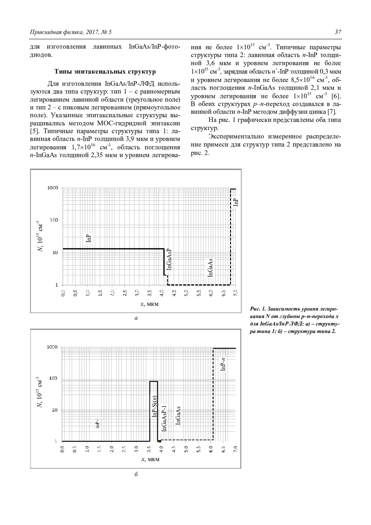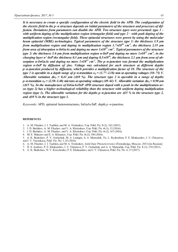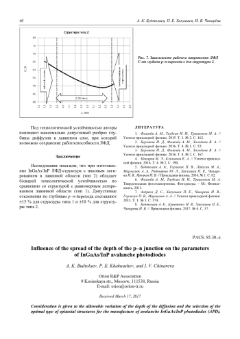 В данной статье говорится о допустимых отклонениях глубины диффузии, выборе оптимального типа эпитаксиальных структур для изготовления лавинных InGaAs/InP-фотодиодов. При изготовлении ЛФД особое внимание уделяется созданию определённой конфигурации электрического поля в структуре. Конфигурация электрического поля в структуре зависит от исходных параметров структуры и от процессов диффузии. Отклонения от параметров приводят к неработоспособности ЛФД. Было представлено два типа структуры: тип 1 – с равномерным легированием лавинной области (треугольное поле) и тип 2 – с пиковым легированием лавинной области (прямоугольное поле). Указанные эпитаксиальные структуры выращивались методом МОС-гидридной эпитаксии. Типичные параметры структуры типа 1: лавинная область n-InP толщиной 3,9 мкм и уровнем легирования 1,71016 см-3, область поглощения n-InGaAs толщиной 2,35 мкм и уровнем легирования не более 11015 см-3. Типичные параметры структуры типа 2: лавинная область n-InP толщиной 3,6 мкм и уровнем легирования не более 11015 см-3 зарядная область n+-InP толщиной 0,3 мкм и уровнем легирования 8,51016 см-3, область поглощения n-InGaAs толщиной 2,1 мкм и уровнем легирования не более 11015 см-3. В обеих структурах p–n-переход создавался в лавинной области n-InP методом диффузии цинка. Для каждой структуры при различных глубин p–n-перехода, создаваемого диффузией, рассчитывалось напряжение, при котором обеспечивался коэффициент умножения равный 10. Структура типа 1 работоспособна в диапазоне глубин p–n-перехода х0 = (1,77– 2,18) мкм при рабочих напряжениях (56–75) В. Допустимый разброс х0 = 0,41 мкм ( 10 %). Структура типа 2 работоспособна в диапазоне глубин p–n-перехода х0 = (2,50–3,40) мкм при рабочих напряжениях (49–61) В. Допустимый разброс х0 = 0,90 мкм ( 15 %). При изготовлении InGaAs/InP ЛФД структура с пиковым легированием в лавинной области (тип 2) обладает большей технологической устойчивостью по сравнению со структурой с равномерным легированием лавинной области (тип 1). Допустимые отклонения по глубинам p–n-перехода составляют ( 15 %) для структуры типа 2, и ( 10 %) для структуры типа 1.