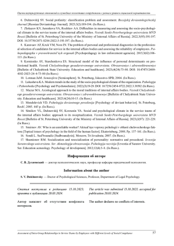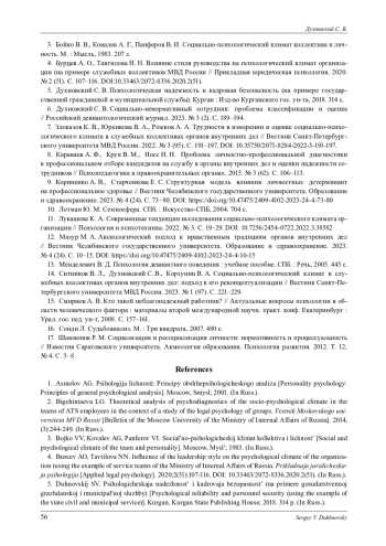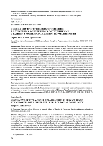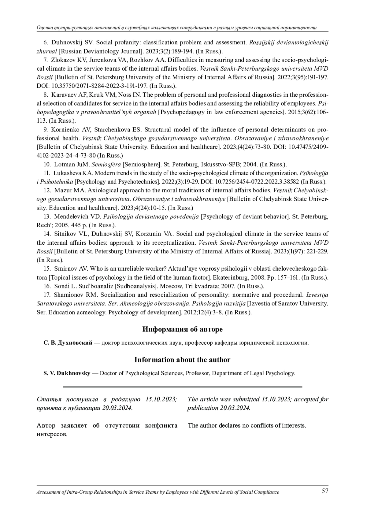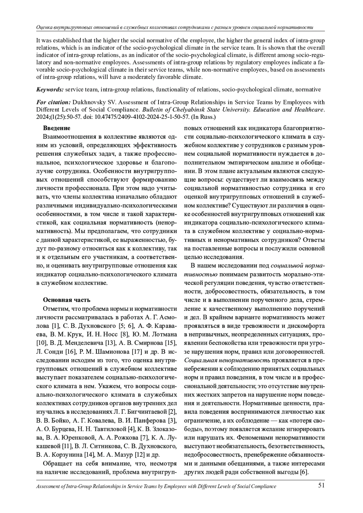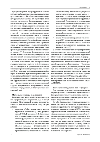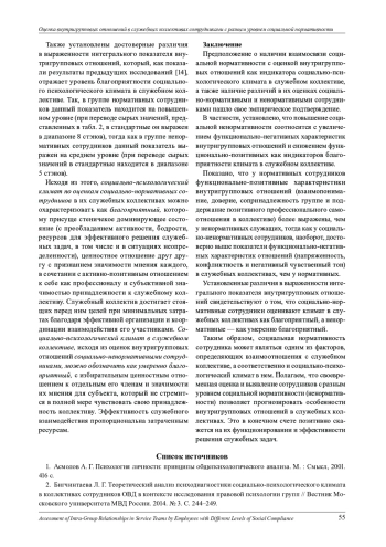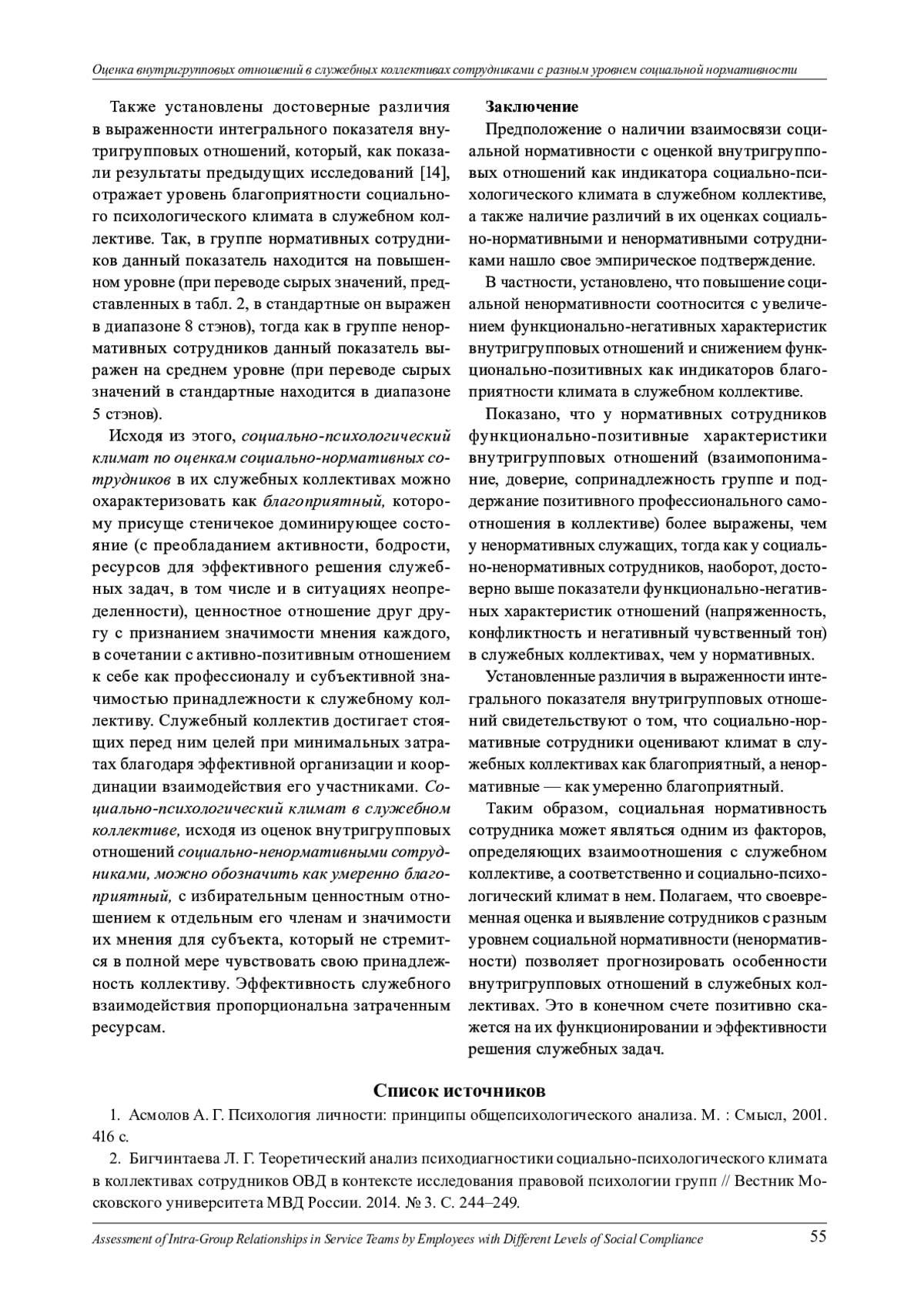 Исследованы внутригрупповые отношения как индикатор благоприятности социально-психологического климата в служебном коллективе у сотрудников с разным уровнем социальной нормативности. Основными методами в исследовании выступили опросник «Субъективная оценка внутригрупповых отношений» и шкала «Социальная нормативность личности». В качестве статистических методов использовали анализ первичных статистик, корреляционный и сравнительный анализ. Респондентами выступил 151 сотрудник органов внутренних дел. Установлено, что чем выше уровень социальной нормативности сотрудника, тем более выражены функционально-позитивные характеристики внутригрупповых отношений (понимание, эмоциональная близость, сопринадлежность коллективу и возможность ощущать себя профессионалом, находясь в нем) и менее выражены функционально-негативные характеристики (напряженность, конфликтность, неблагоприятный чувственный тон в отношениях). Установлено, что чем выше социальная нормативность сотрудника, тем выше общий индекс внутригрупповых отношений, являющийся индикатором социально-психологического климата в служебном коллективе. Общий показатель внутригрупповых отношений как индикатор социально-психологического климата различен у социально-нормативных и ненормативных сотрудников. Оценки внутригрупповых отношений нормативными сотрудниками говорят о благоприятном социально-психологическом климате в служебных коллективах, тогда как у ненормативных сотрудников, исходя из оценок внутригрупповых отношений, климат будет являться умеренно благоприятным.
