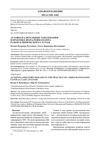 Представлено описание аутовоспалительных заболеваний, встречаемых в практике ревматолога, описан клинический случай пациента с аутовоспалительным заболеванием: криопиринассоциированный периодический синдром (САРS), форма: CINCA/NOMID, диагностика и лечение.