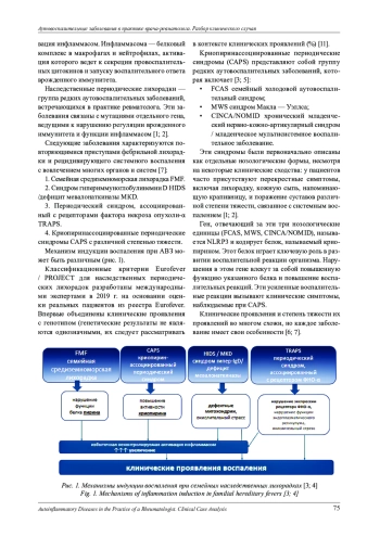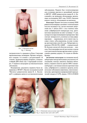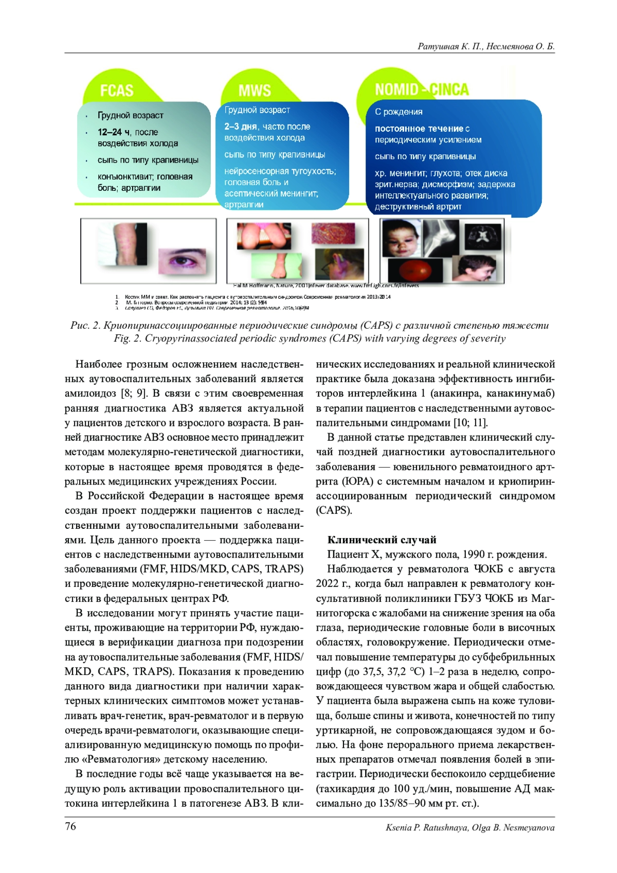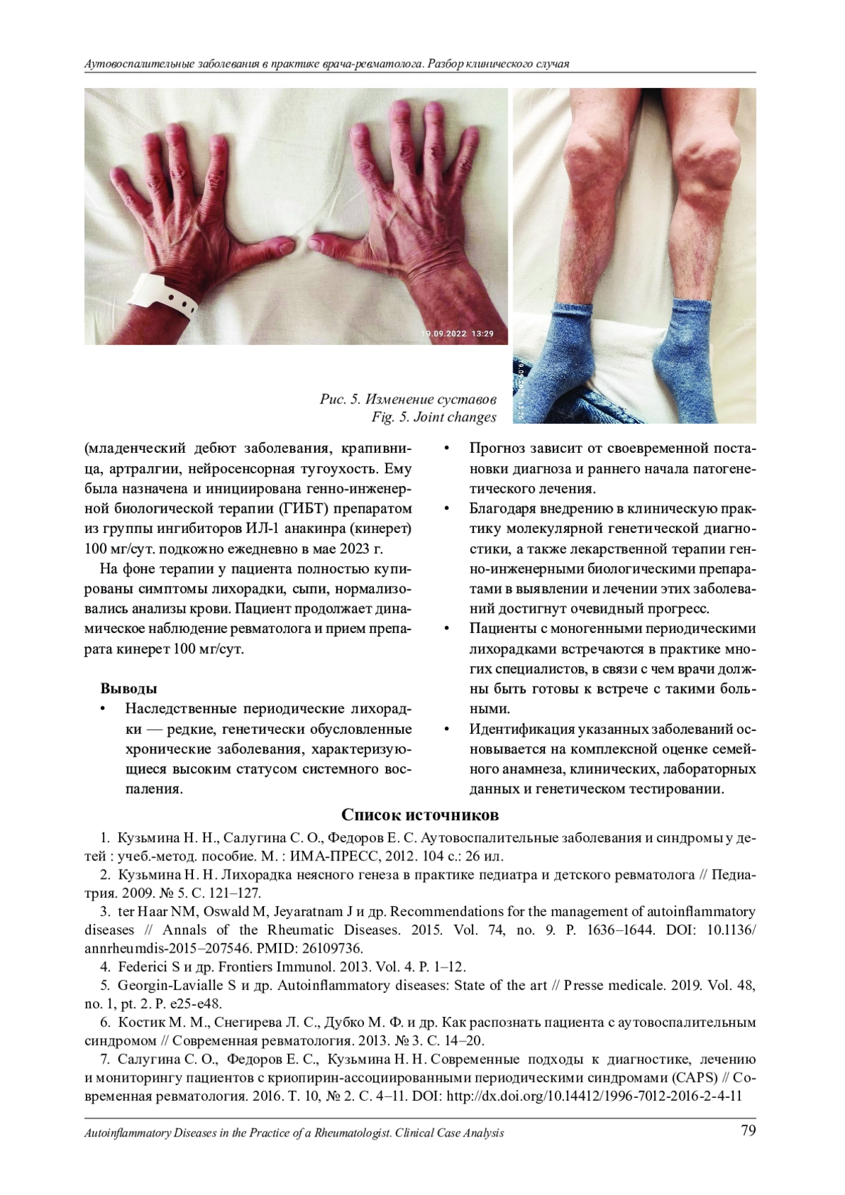 7. Салугина С. О., Федоров Е. С., Кузьмина Н. Н. Современные подходы к диагностике, лечению и мониторингу пациентов с криопирин-ассоциированными периодическими синдромами (CAPS) // Со- Рис. 5. Изменение суставов Fig. 5. Joint changes Ратушная К. П., Несмеянова О. Б. Ksenia P. Ratushnaya, Olga В. Nesmeyanova80 временная ревматология. 2016. Т. 10, № 2. С. 4-11. DOI: 10.14412/1996-7012-2016-2-4-11