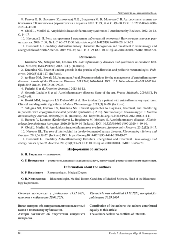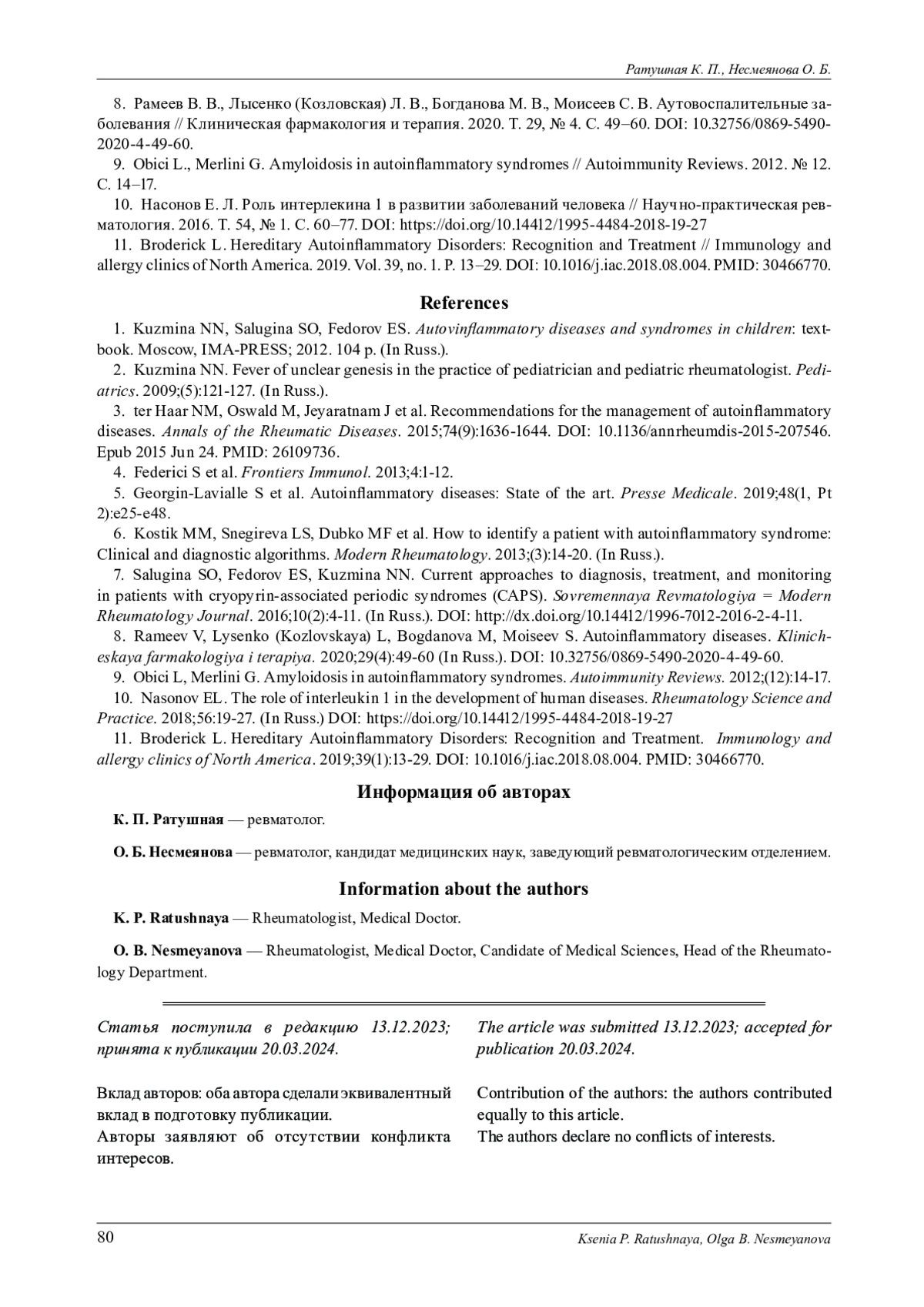 8. Рамеев В. В., Лысенко (Козловская) Л. В., Богданова М. В., Моисеев С. В. Аутовоспалительные заболевания // Клиническая фармакология и терапия. 2020. T. 29, № 4. С. 49-60. 10.32756/0869-5490- 2020-4-49-60. DOI: 10.32756/0869-5490-2020-4-49-60 EDN: RYZQPD