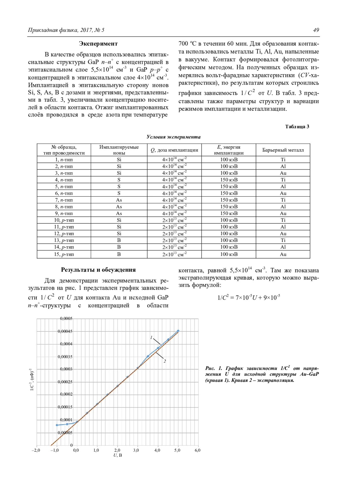 В работе продемонстрировано, что необходимое снижение высоты барьера «металл– полупроводник» для сдвига спектральной чувствительности GaP в инфракрасную область может быть получено путем подлегирования контактной области эпитаксиального слоя n-типа проводимости ионами Si с энергией 100 кэВ и дозой (флюенсом) 41014 см-2 с последующим отжигом имплантированного слоя в течении 60 минут в атмосфере N2 при температуре 700 оС. В качестве барьерного металла может быть использована золотая плёнка, напылённая в вакууме. Результаты исследования показали, что увеличение концентрации носителей заряда в области контакта до значений 1019 см-3 даёт возможность снижения высоты барьера Au-n-GaP до 0,2 эВ.
