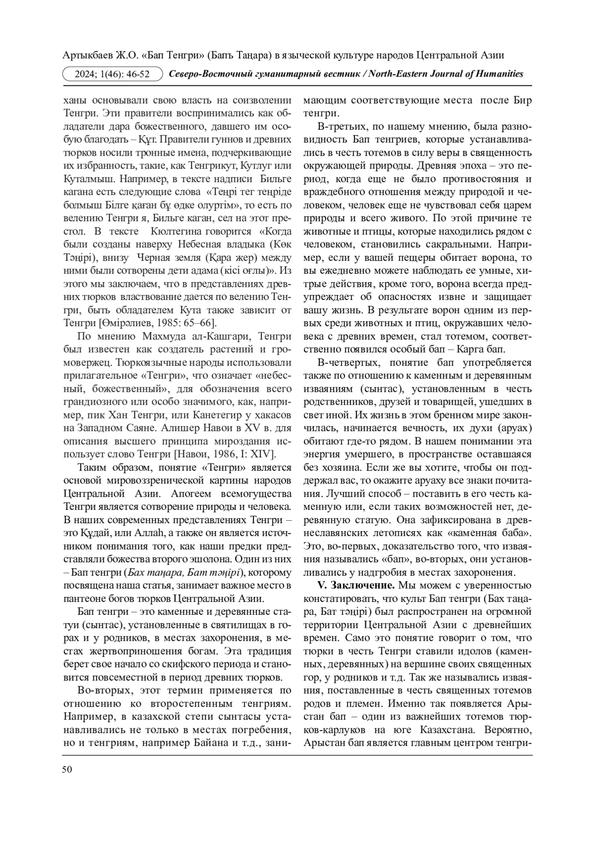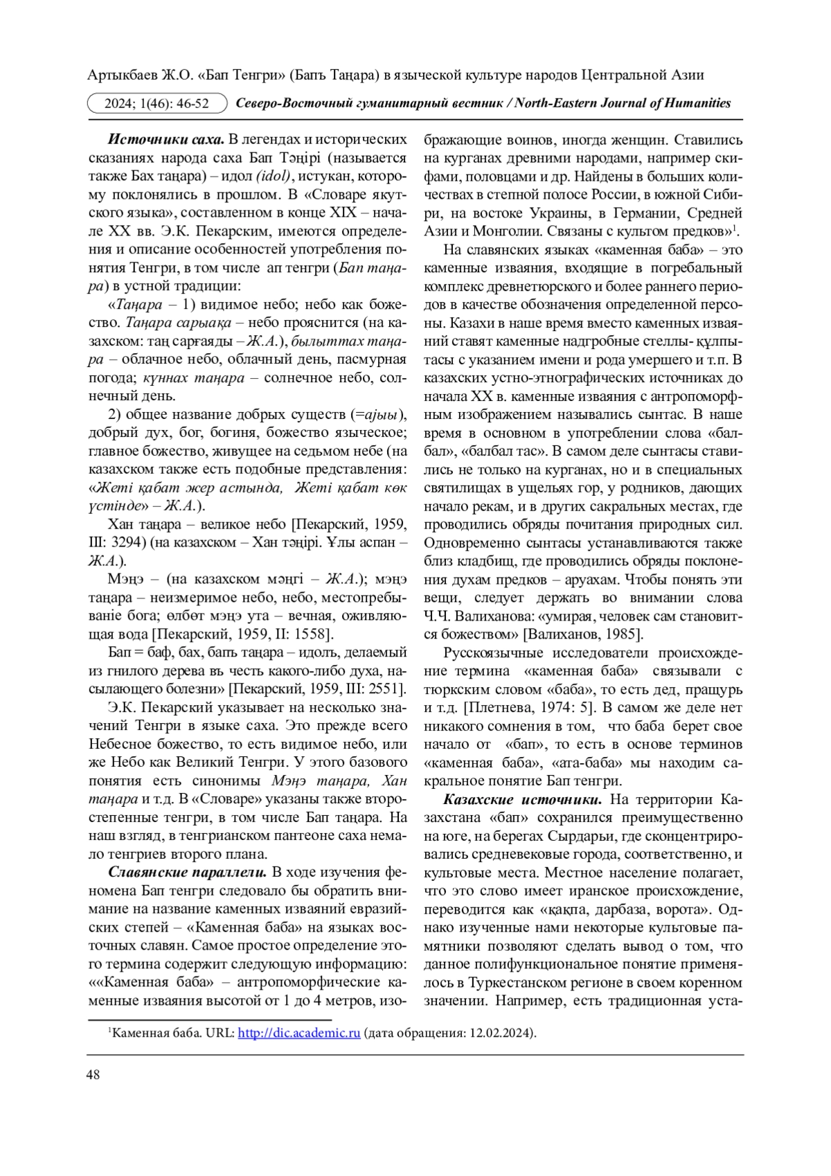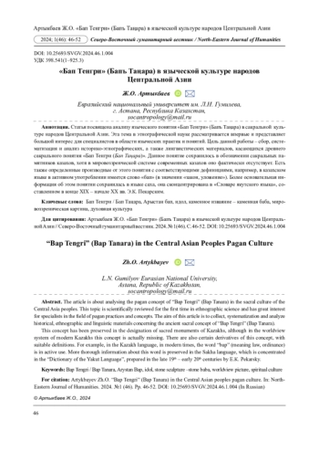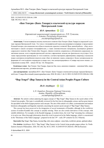 Цель данной работы - сбор, систематизация и анализ историко-этнографических, а также лингвистических материалов, касающихся древнего сакрального понятия «Бап Тенгри (Бап Таңара)». Данное понятие сохранилось в обозначении сакральных памятников казахов, хотя в мировоззренческой системе современных казахов оно фактически отсутствует. Есть также определенные производные от этого понятия с соответствующими дефинициями, например, в казахском языке в активном употреблении имеется слово «бап» (в значении «закон, уложение»). Более основательная информация об этом понятии сохранилась в языке саха, она сконцентрирована в «Словаре якутского языка», составленном в конце ХІХ - начале ХХ вв. Э. К. Пекарским.