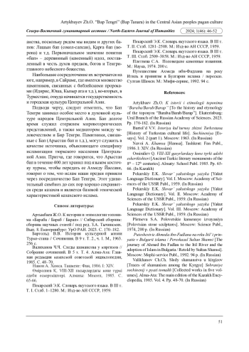 1. Артыкбаев Ж.О. К истории и этимологии топонима “Бараба / Бараб / Барап” // Сибирский сборник: сборник научных статей / под ред. З.А. Тычинских. Вып. 8. Екатеринбург: УрО РАН. 2023. С. 170-182. EDN: QJMAXA