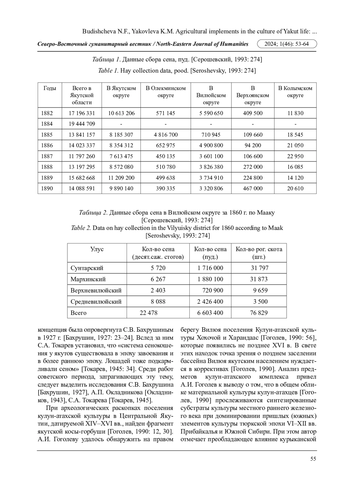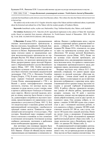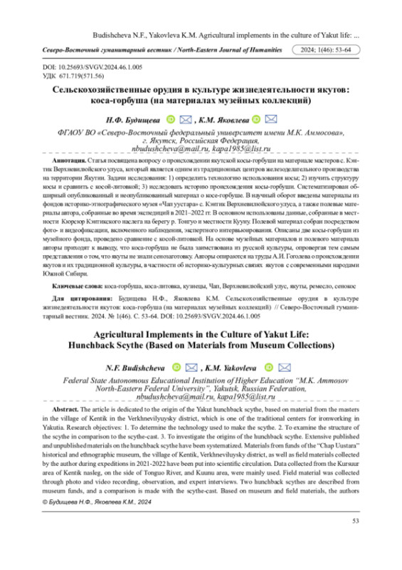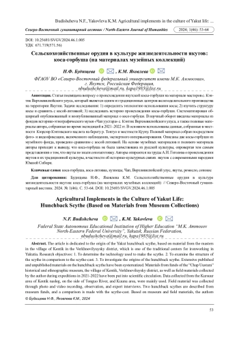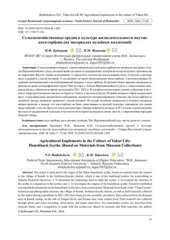 Задачи исследования: 1) определить технологию использования косы; 2) изучить структуру косы и сравнить с косой-литовкой; 3) исследовать историю происхождения косы-горбуши. Систематизирован обширный опубликованный и неопубликованный материал о косе-горбуше. В научный оборот введены материалы из фондов историко-этнографического музея «Чап уустара» с. Кэнтик Верхневилюйского улуса, а также полевые материалы автора, собранные во время экспедиций в 2021-2022 гг. В основном использованы данные, собранные в местности Кюрсюр Кэнтикского наслега на берегу р. Тонгуо и местности Кууну. Полевой материал собран посредством фото- и видеофиксации, включенного наблюдения, экспертного интервьюирования. Описаны две косы-горбуши из музейного фонда, проведено сравнение с косой-литовкой. На основе музейных материалов и полевого материала авторы приходят к выводу, что коса-горбуша не была заимствована из русской культуры, опровергая тем самым представления о том, что якуты не знали сенозаготовку. Авторы опираются на труды А. И. Гоголева о происхождении якутов и их традиционной культуры, в частности об историко-культурных связях якутов с современными народами Южной Сибири.
