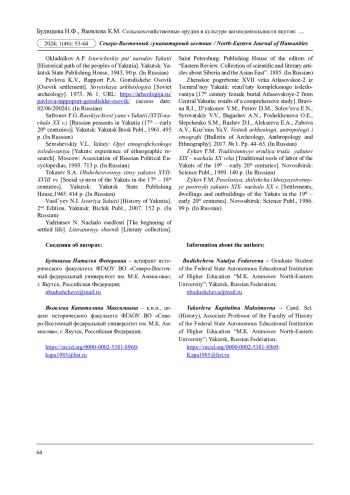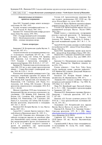 15. Зыков Ф.М. Традиционные орудия труда якутов XIX - начала XX вв. Новосибирск: Наука, 1989. 140 с. EDN: YPSNDV