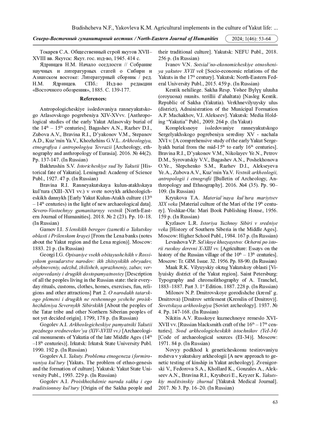 6. Бравина Р.И. Раннеякутская кулун-атахская культура (XIII-XVI вв.) в свете новых археологических данных // Северо-Восточный гуманитарный вестник. 2018. № 2 (23). С. 10-18. EDN: XTXPVB