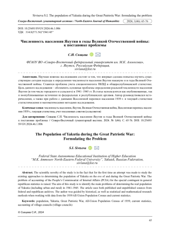 Цель данного исследования - обозначить основные проблемы определения реальной численности населения Якутии (в том числе городского и сельского) в 1941-1945 гг. В статье используются как опубликованные, так и неопубликованные источники из федеральных и республиканских архивов. Автор руководствовался историческими, а также при работе с данными Всесоюзной переписи населения 1939 г. и текущей статистики статистическими и математическими методами исследования.