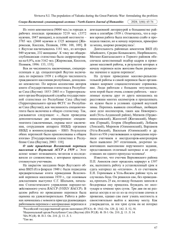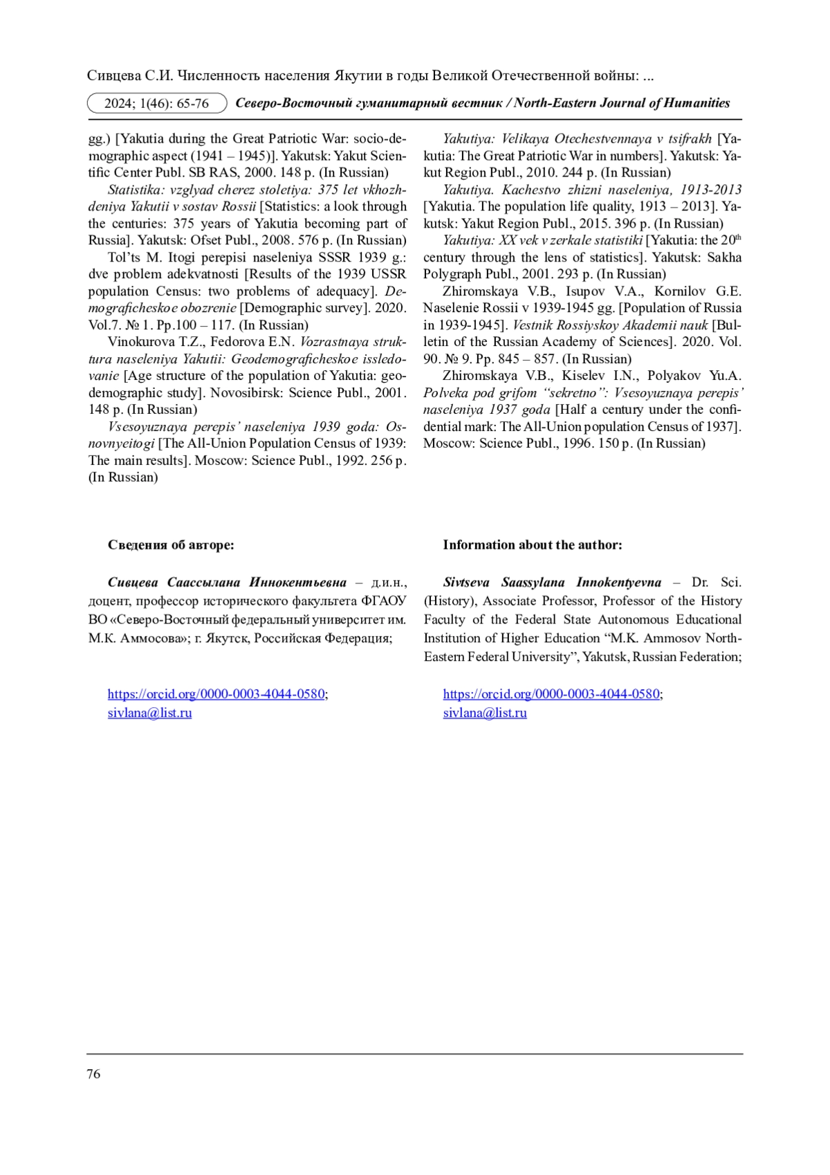 13. Сивцева С.И. Якутия в годы Великой Отечественной войны: социально-демографический аспект (1941-1945 гг.). Якутск: Изд-во ЯНЦ СО РАН, 2000. 148 с. EDN: UHQKBP