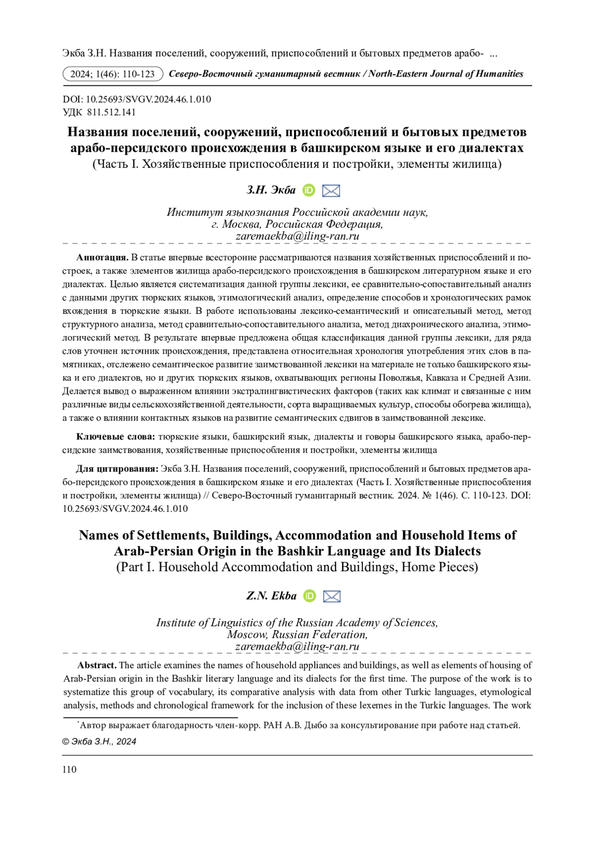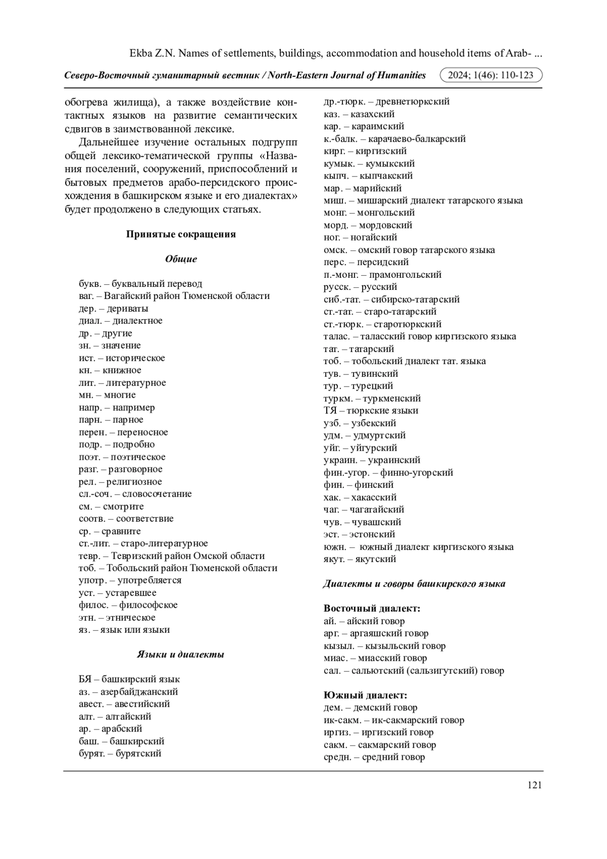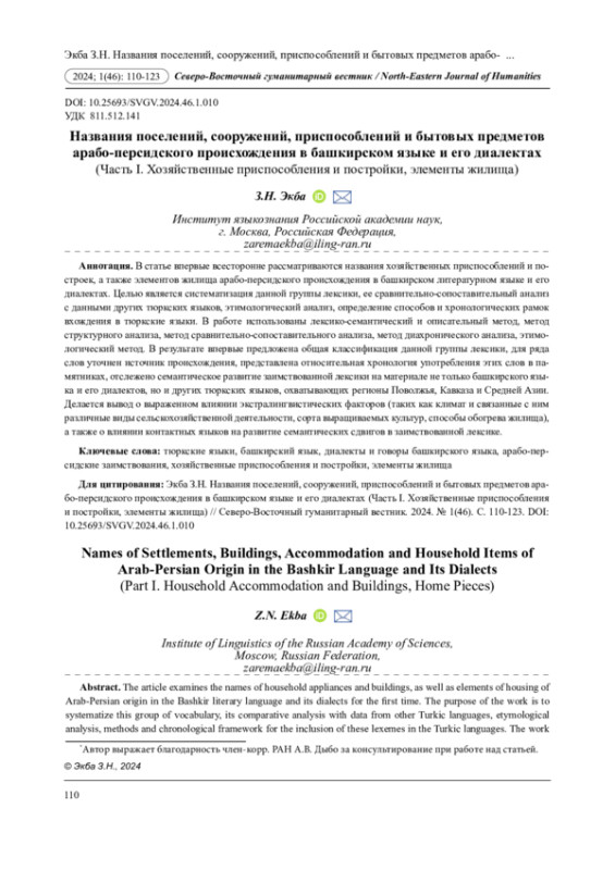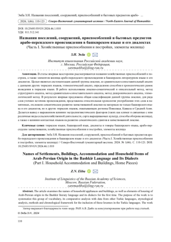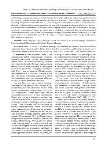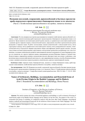 В статье впервые всесторонне рассматриваются названия хозяйственных приспособлений и построек, а также элементов жилища арабо-персидского происхождения в башкирском литературном языке и его диалектах.