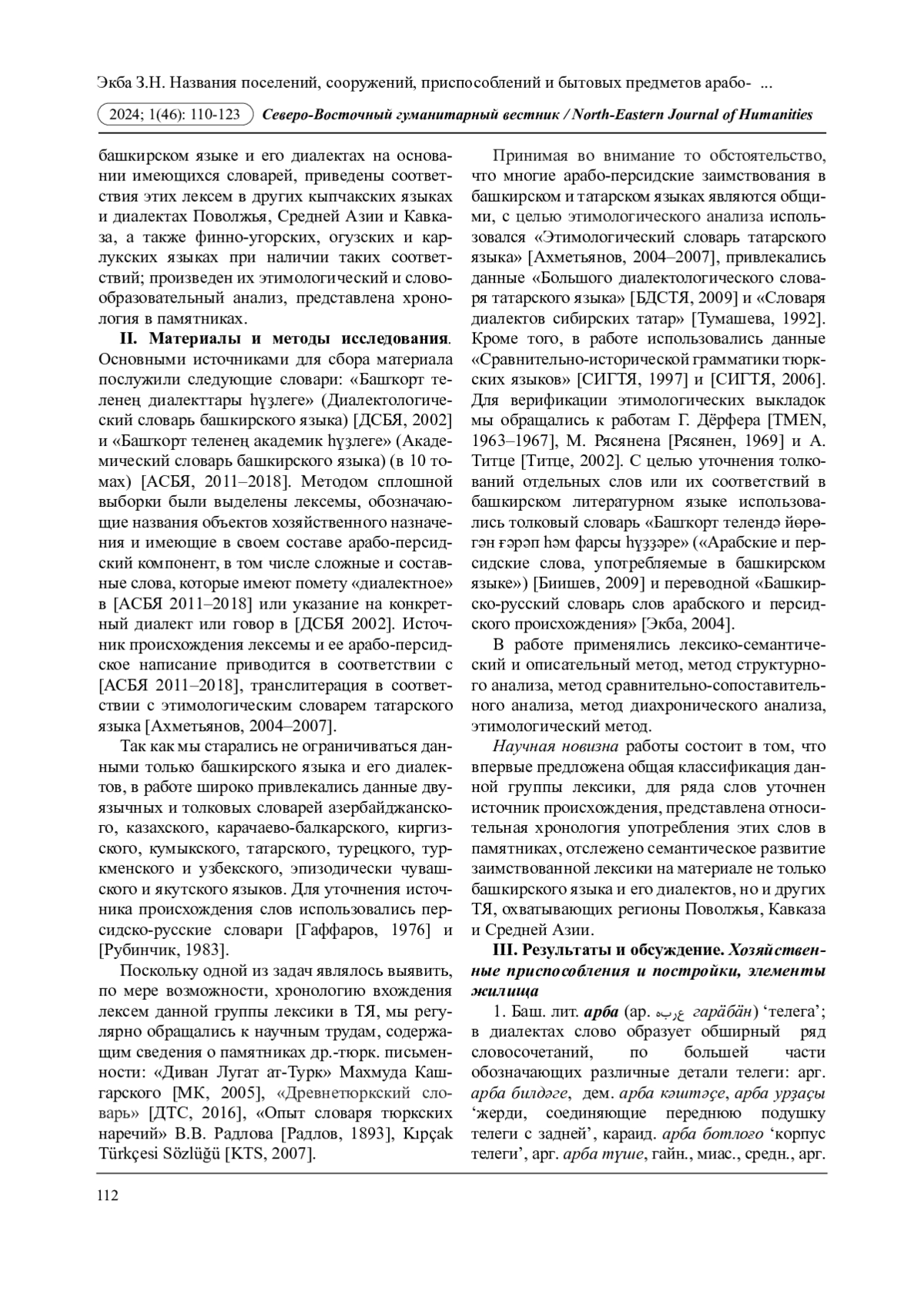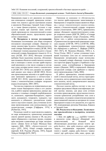 Целью является систематизация данной группы лексики, ее сравнительно-сопоставительный анализ с данными других тюркских языков, этимологический анализ, определение способов и хронологических рамок вхождения в тюркские языки. В работе использованы лексико-семантический и описательный метод, метод структурного анализа, метод сравнительно-сопоставительного анализа, метод диахронического анализа, этимологический метод. В результате впервые предложена общая классификация данной группы лексики, для ряда слов уточнен источник происхождения, представлена относительная хронология употребления этих слов в памятниках, отслежено семантическое развитие заимствованной лексики на материале не только башкирского языка и его диалектов, но и других тюркских языков, охватывающих регионы Поволжья, Кавказа и Средней Азии. Делается вывод о выраженном влиянии экстралингвистических факторов (таких как климат и связанные с ним различные виды сельскохозяйственной деятельности, сорта выращиваемых культур, способы обогрева жилища), а также о влиянии контактных языков на развитие семантических сдвигов в заимствованной лексике.