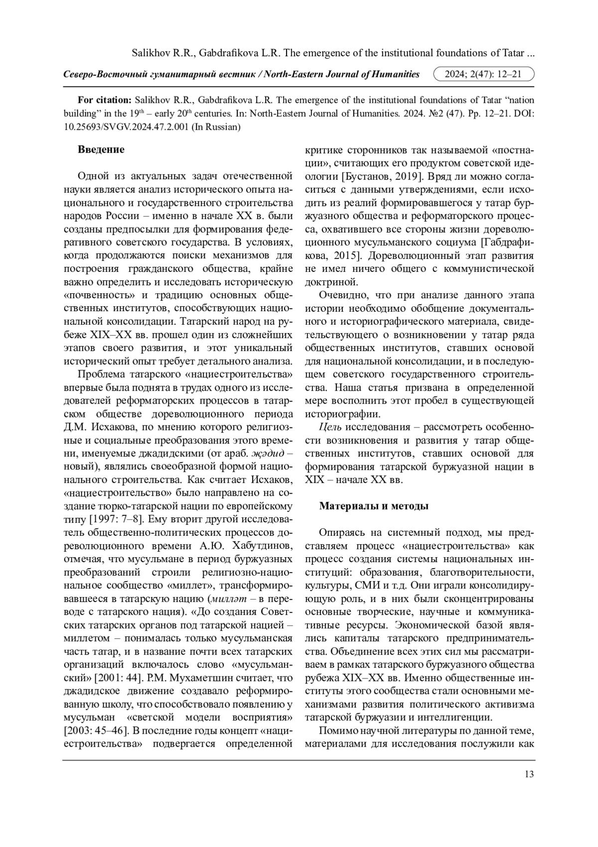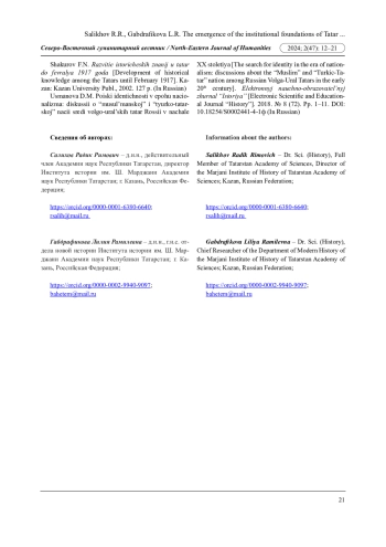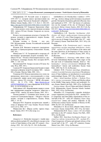 15. Усманова Д.М. Поиски идентичности в эпоху национализма: дискуссии о “мусульманской” и “тюрко-татарской” нации среди волго-уральских татар России в начале ХХ столетия // ЭНОЖ “История”. 2018. № 8 (72). URL: https://history.jes.su/s207987840002441-4-1(дата обращения: 04.06.2024). ф. DOI: 10.18254/S0002441-4-1 EDN: PPLUPX