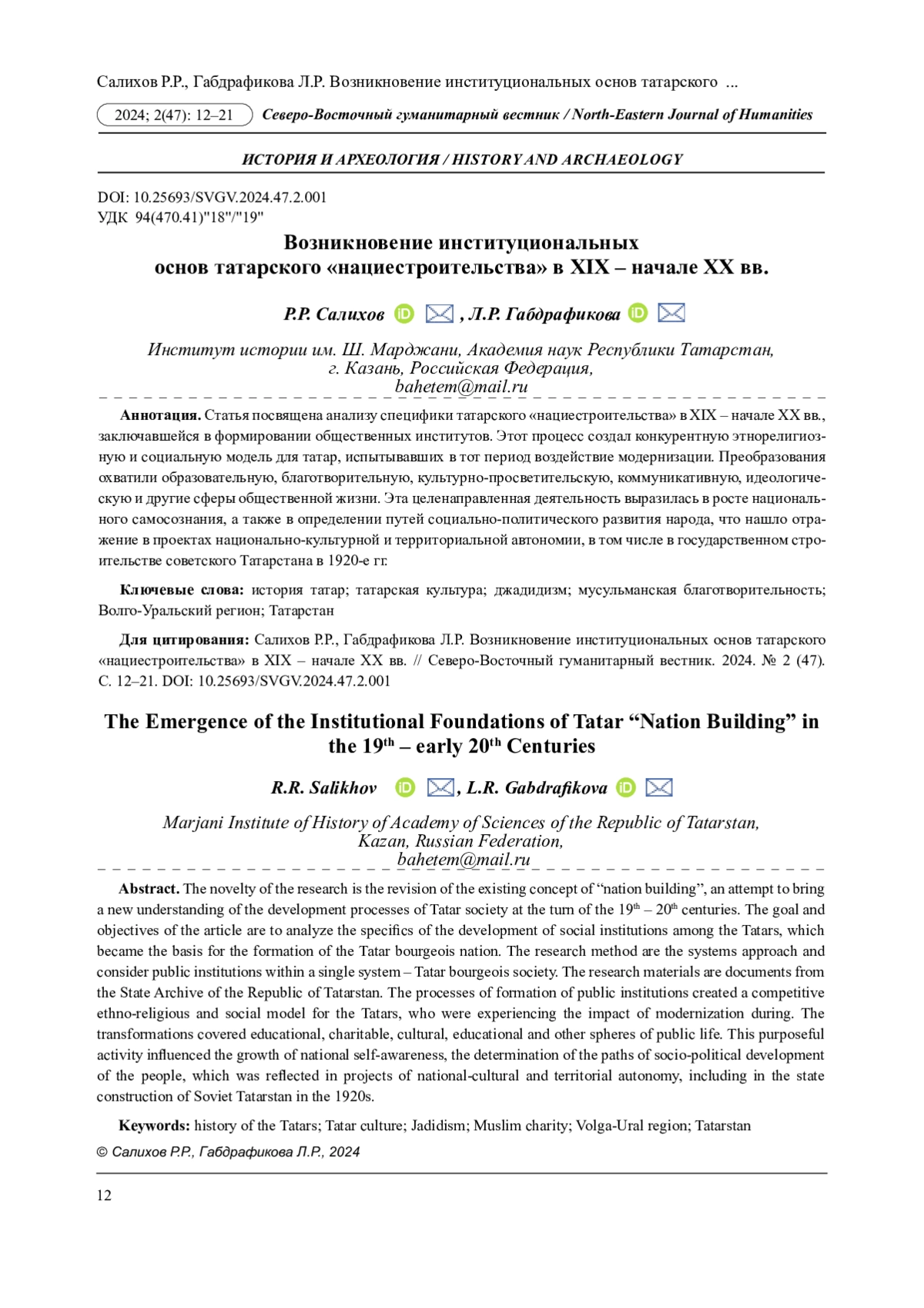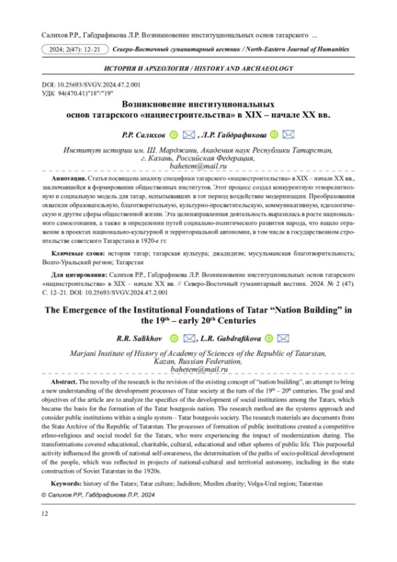 Статья посвящена анализу специфики татарского «нациестроительства» в XIX - начале XX вв., заключавшейся в формировании общественных институтов. Этот процесс создал конкурентную этнорелигиозную и социальную модель для татар, испытывавших в тот период воздействие модернизации. Преобразования охватили образовательную, благотворительную, культурно-просветительскую, коммуникативную, идеологическую и другие сферы общественной жизни. Эта целенаправленная деятельность выразилась в росте национального самосознания, а также в определении путей социально-политического развития народа, что нашло отражение в проектах национально-культурной и территориальной автономии, в том числе в государственном строительстве советского Татарстана в 1920-е гг.