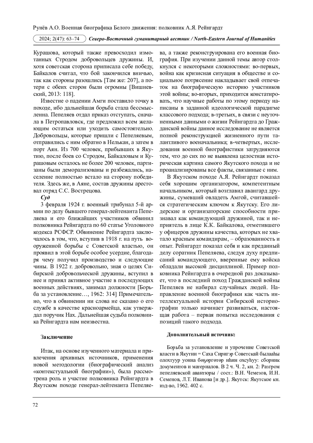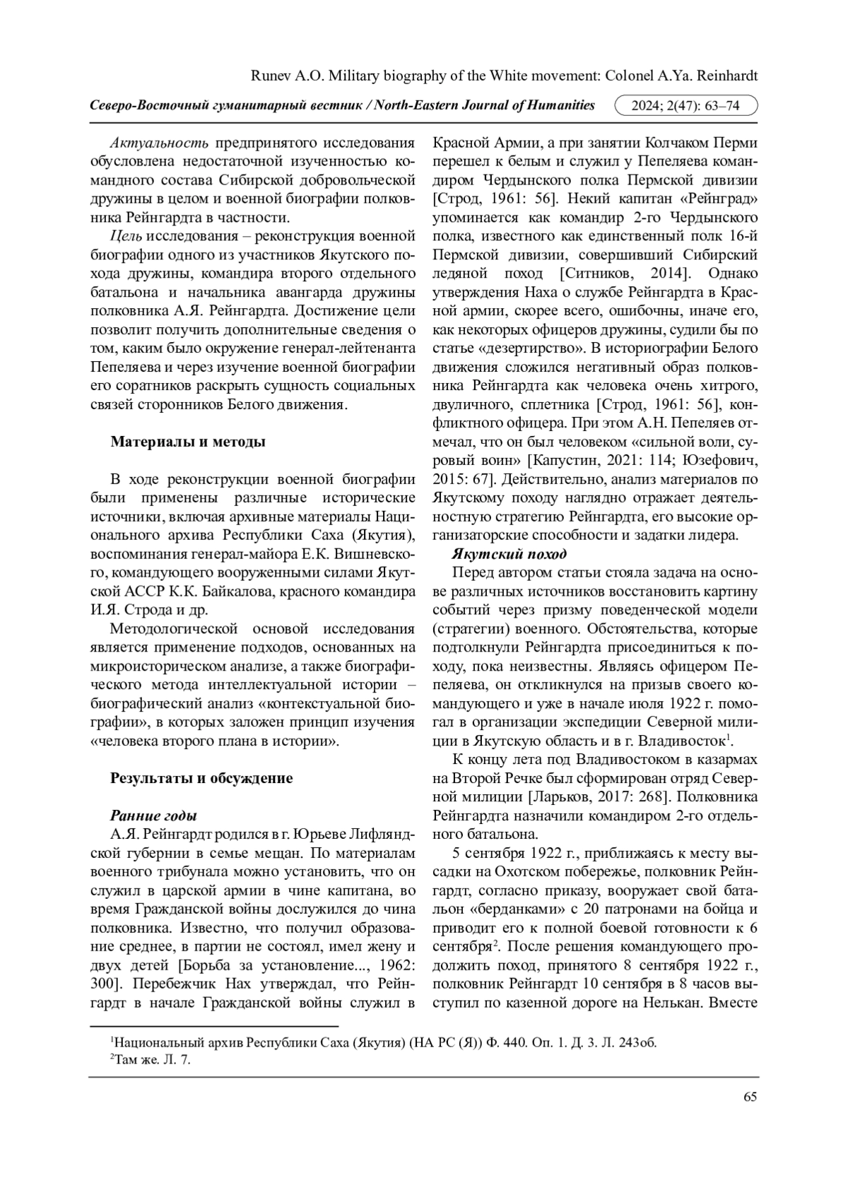 Статья посвящена реконструкции военной биографии участника Якутского похода начальника авангарда Сибирской добровольческой дружины полковника А. Я. Рейнгардта. На основе архивных источников и новой методологии была воссоздана военная биографическая история, введены в научный оборот личные документы, раскрывающие сложный жизненный мир офицера Белой армии. В ходе изучения его биографии были выявлены контакты, личные связи и раскрыта стратегия его деятельности в условиях военного похода. В результате автор приходит к выводу, что полковник Рейнгардт играл важную роль в Якутском походе, поскольку именно его отряд занял важнейший пункт - с. Амга, который считался стратегическим ключом к взятию г. Якутска. Данная работа важна для всестороннего и объективного освещения событий Гражданской войны в России, а также восполнения антропологических исследований в проекциях биографии Белого движения.